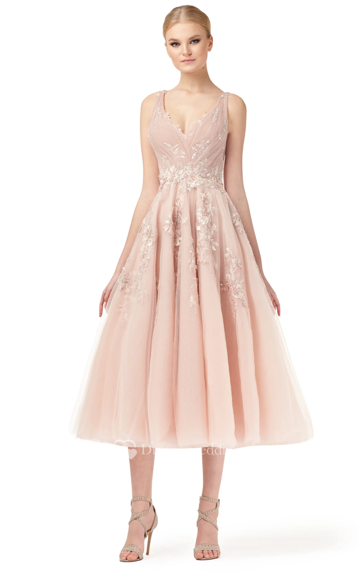 A Line V-neck Tulle Vintage Evening Dress with Appliques