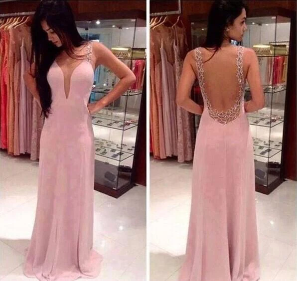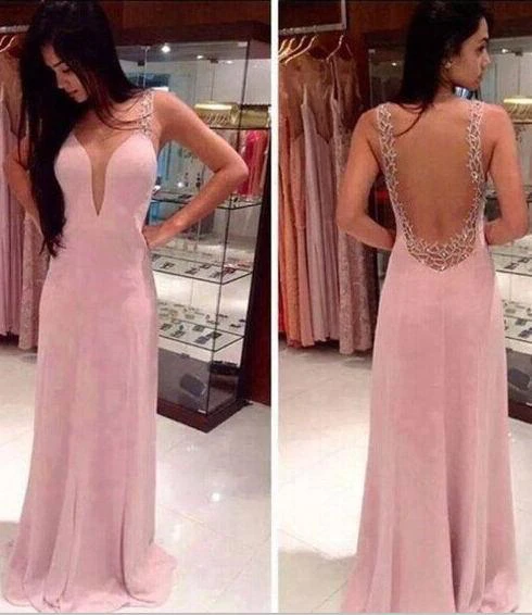 Prom Dresses Deep V Neck Straps Pink Sheer Back Beading Sweep Train Evening Giowns