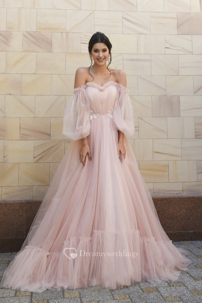 3/4 Poet Sleeves Charming Tulle Sweetheart Off-shoulder Wedding Dress