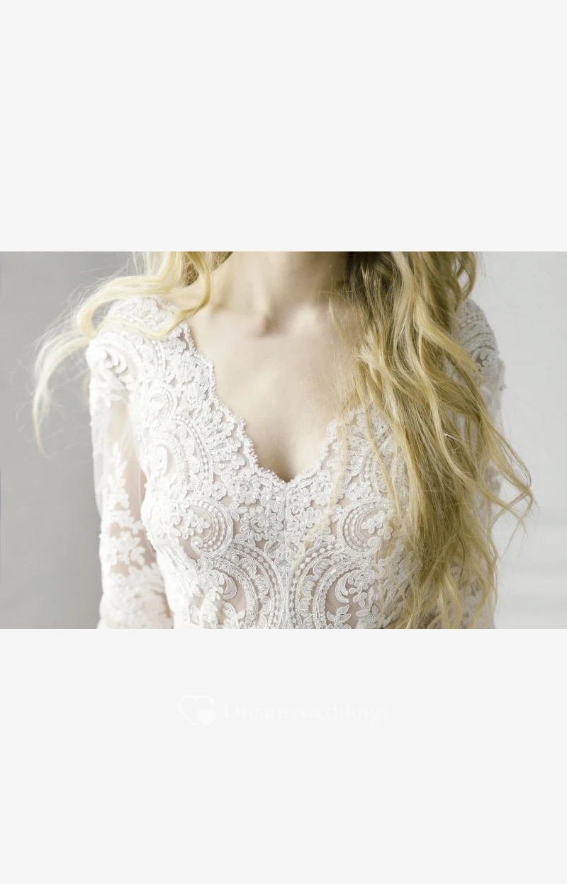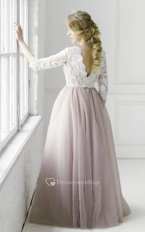 3/4 Sleeve Lace V-neck Adorable Tulle Wedding Dress