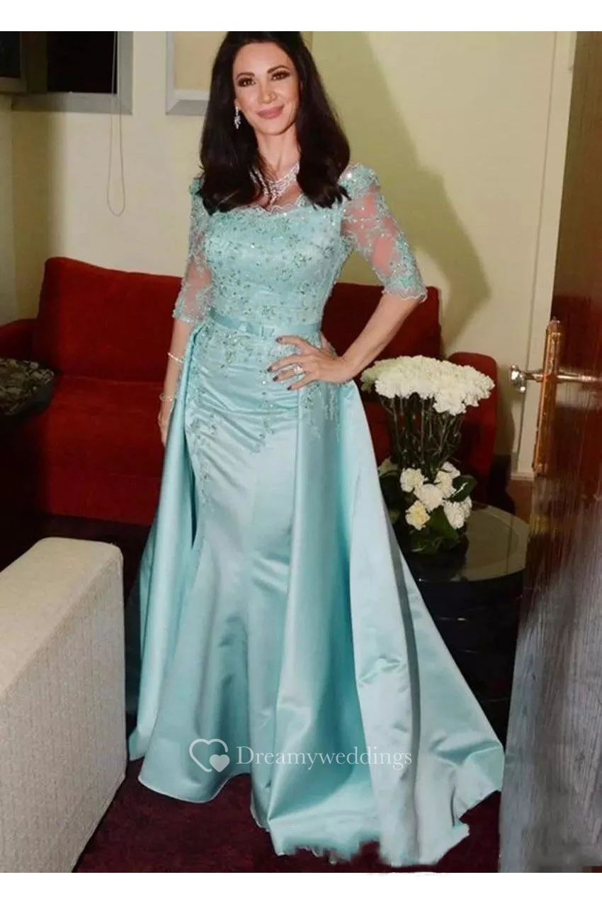 3-4 Length Sleeve Illusion Satin Lace Sexy Bodycon Scoop Luxury Women Floor-length Appliques Evening Dress