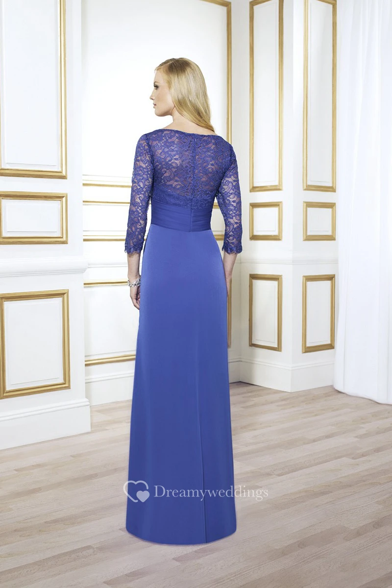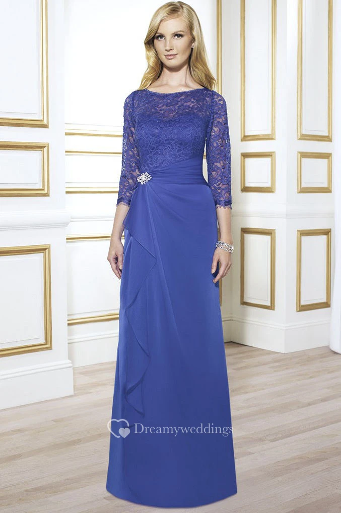3-4 Sleeve Lace Bateau Neck Chiffon Formal Dress With Broach And Draping