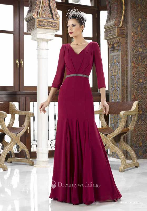 3-4 Sleeve V-Neck Jeweled Chiffon Mother Of The Bride Dress