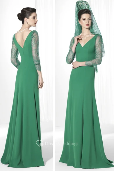 3-4-Sleeve V-Neck Lace Floor-Length Jersey Prom Dress