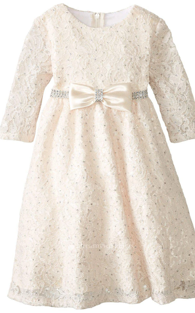 3-4 Sleeved A-line Lace Dress With Bow and Beadings