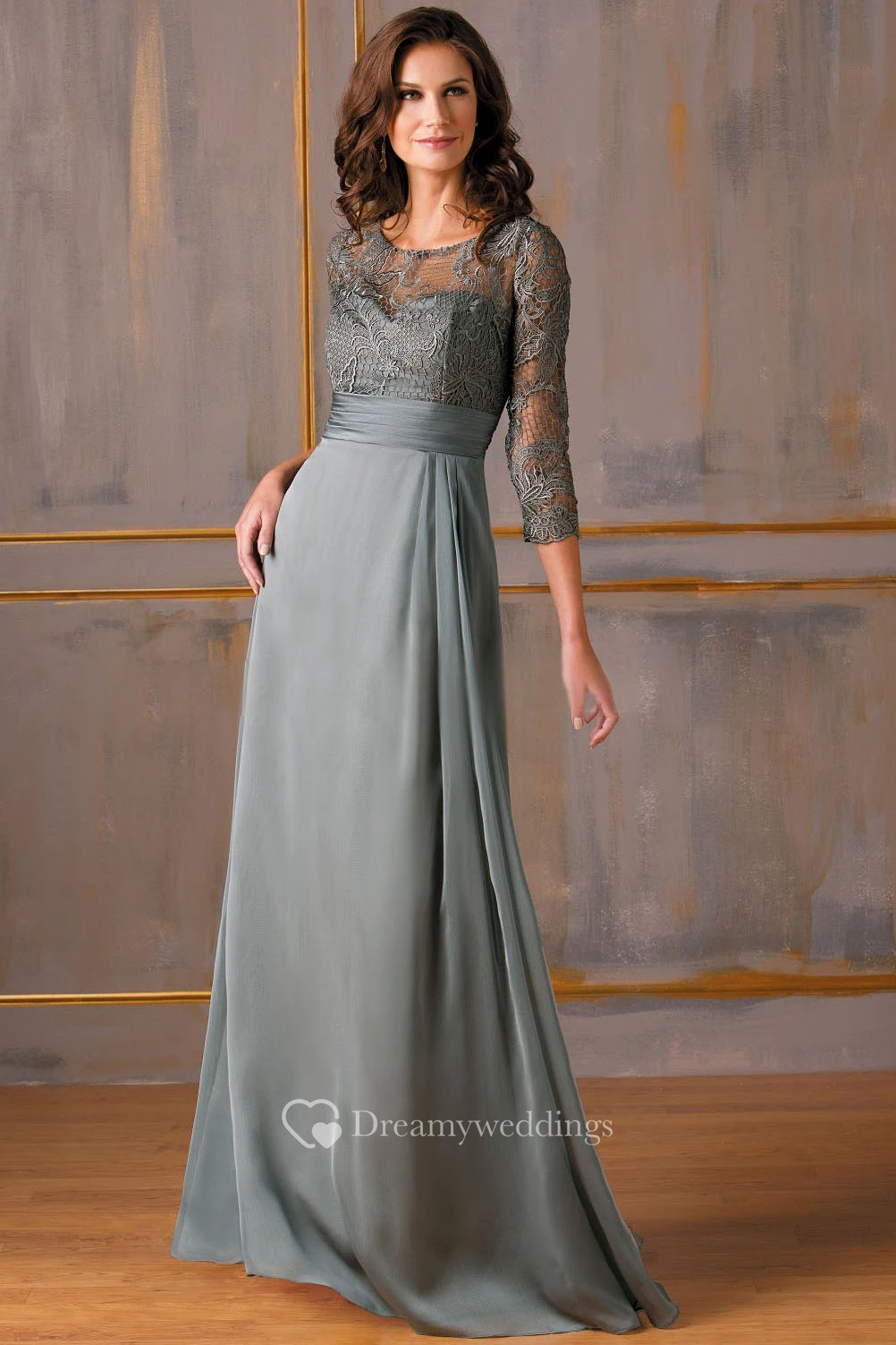 3-4 Sleeved Gown With Lace Bodice And Keyholes Back