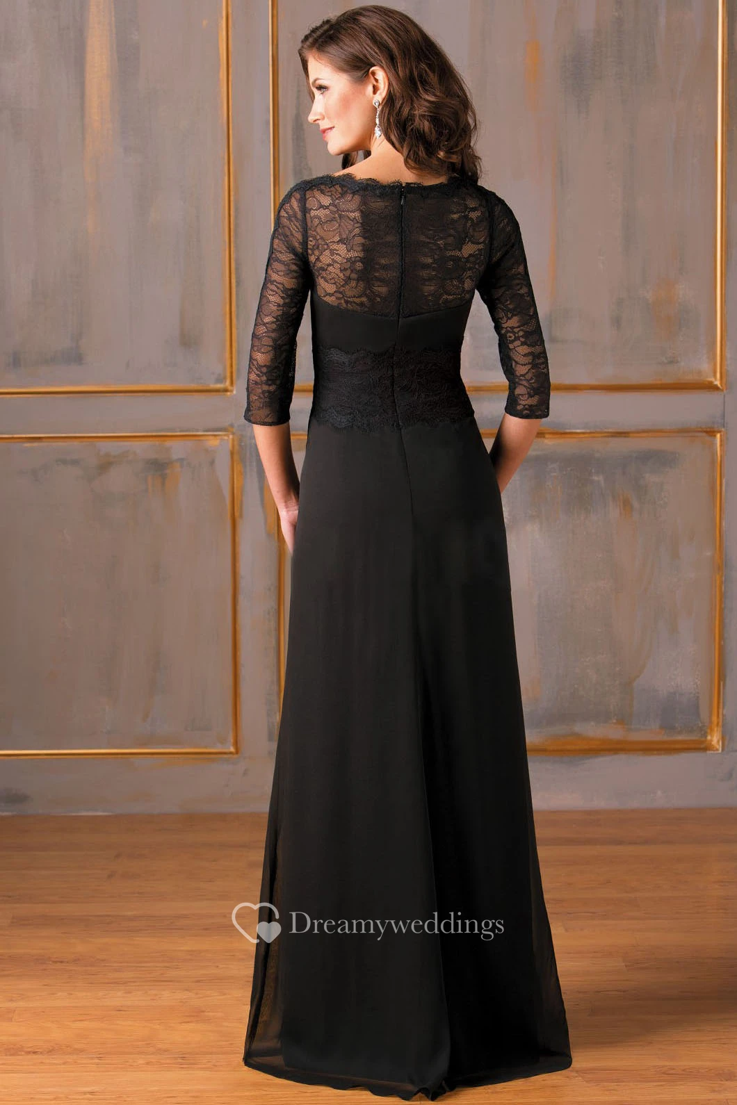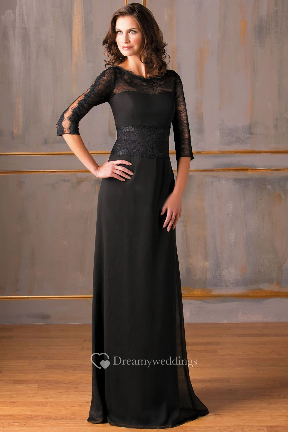 3-4 Sleeved Long Chiffon Mother Of The Bride Dress With Lace And Sweep Train