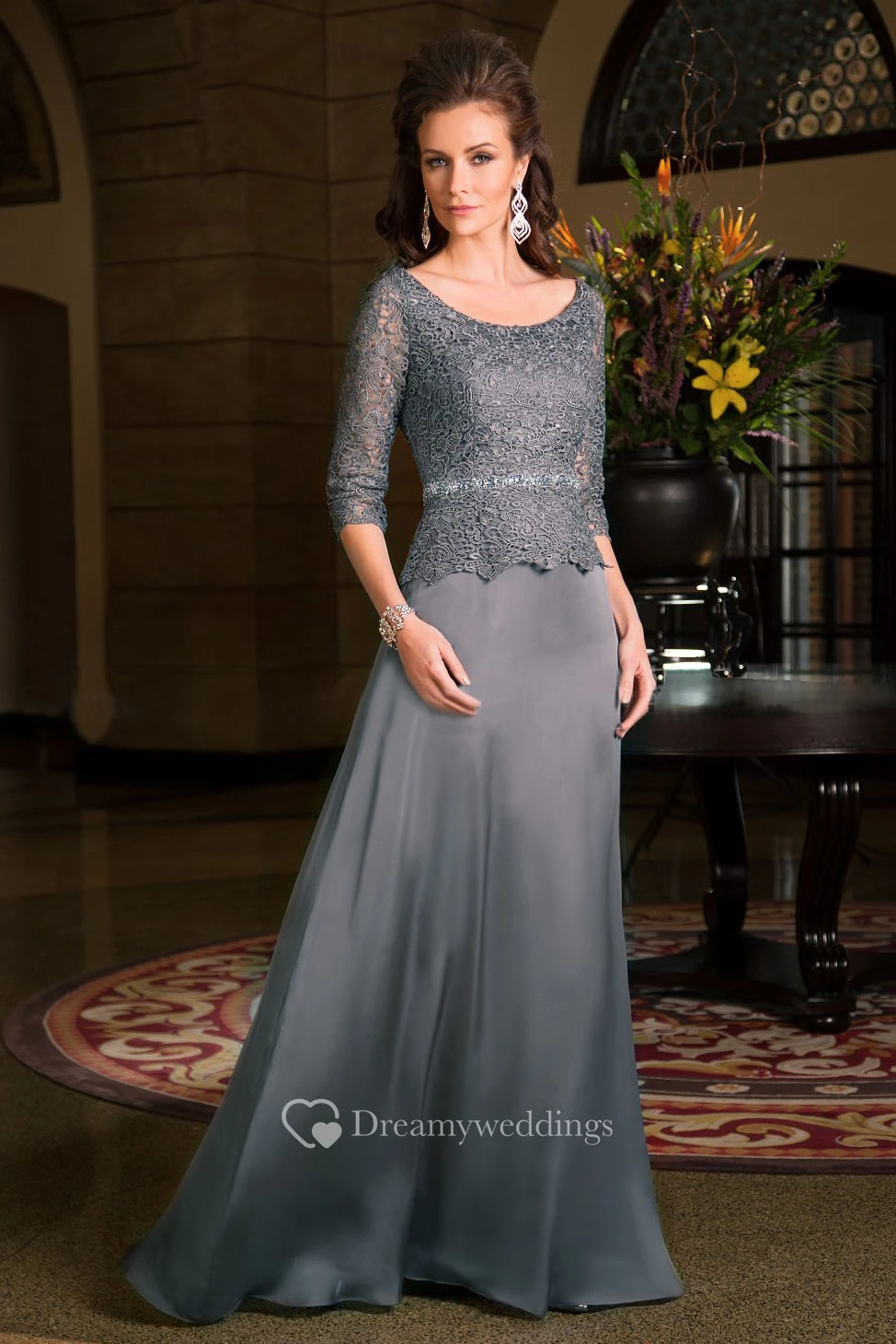 3-4 Sleeved Scoop-Neck Long Mother Of The Bride Dress With Lace Bodice