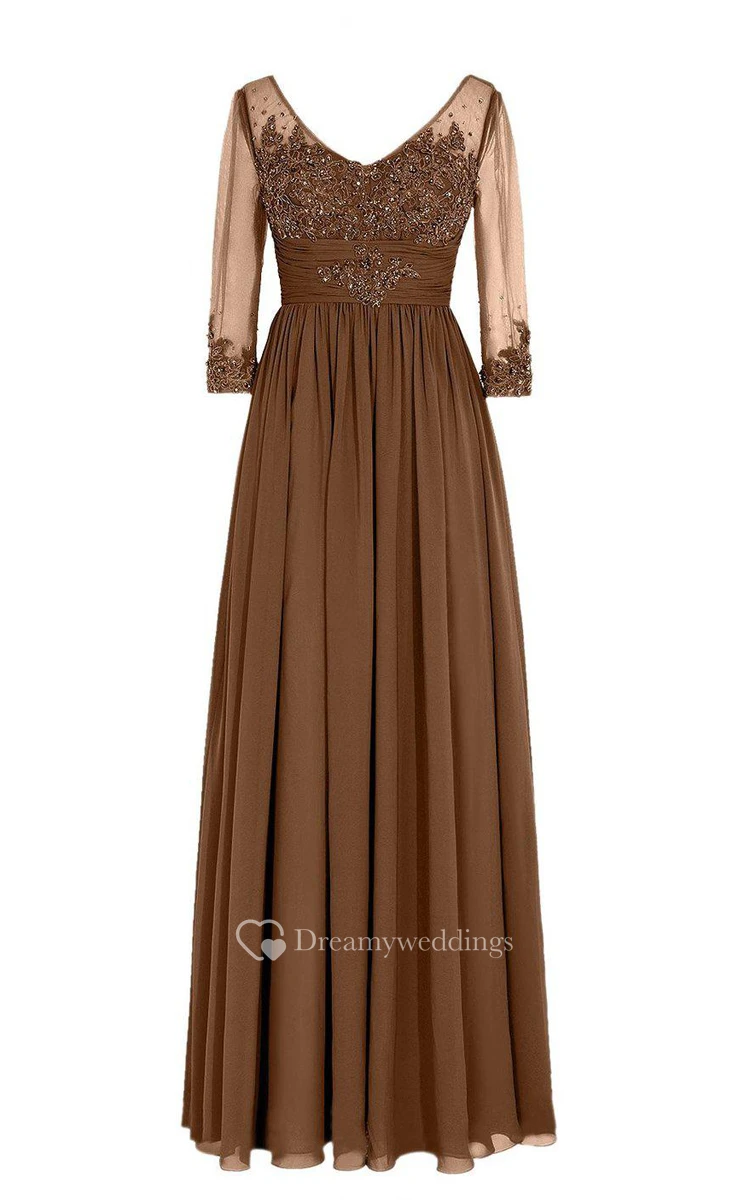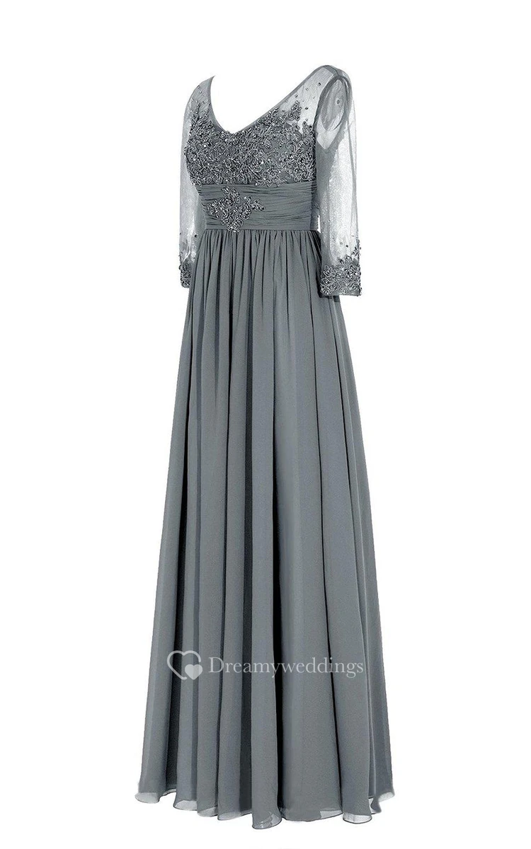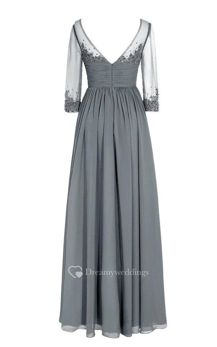 3-4 Sleeved V-neck Chiffon Gown With Illusion Sleeves