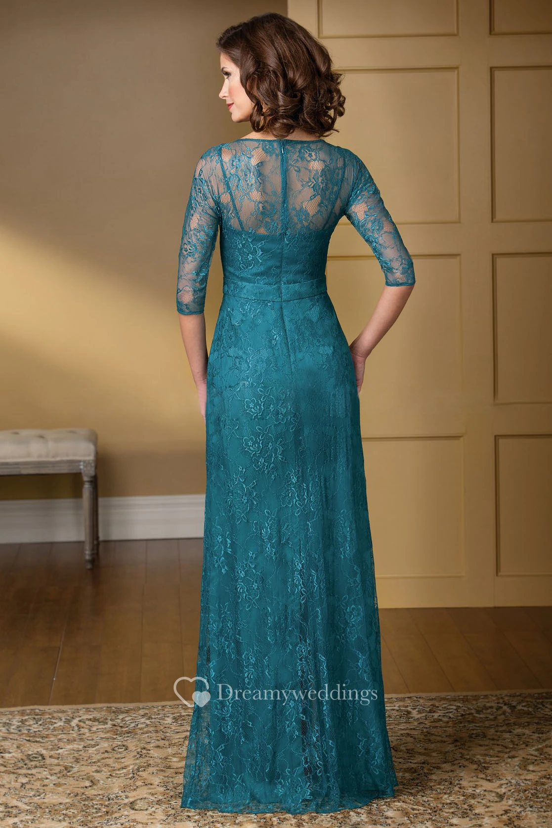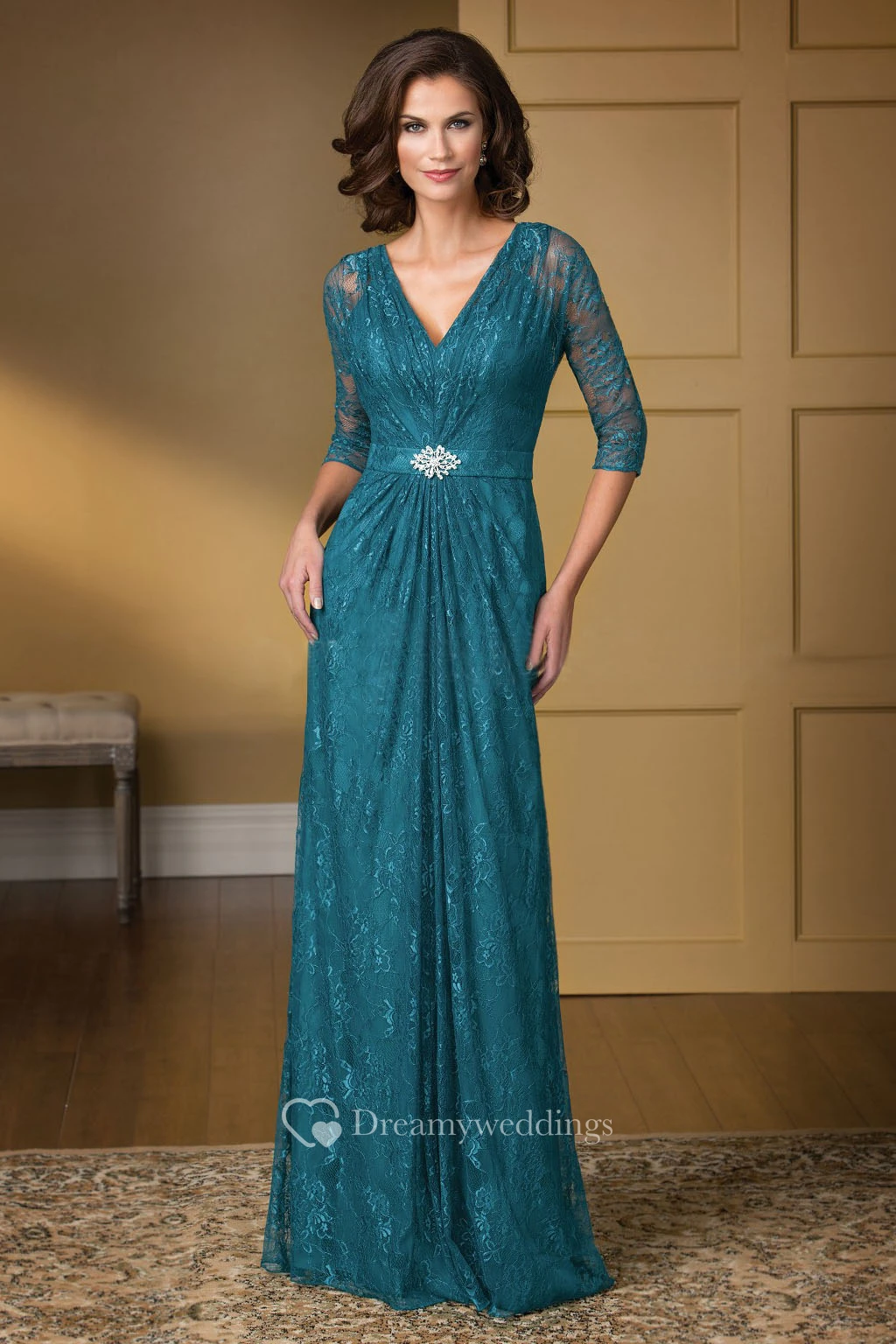 3-4 Sleeved V-Neck Lace Gown With Beadings And Illusion Back
