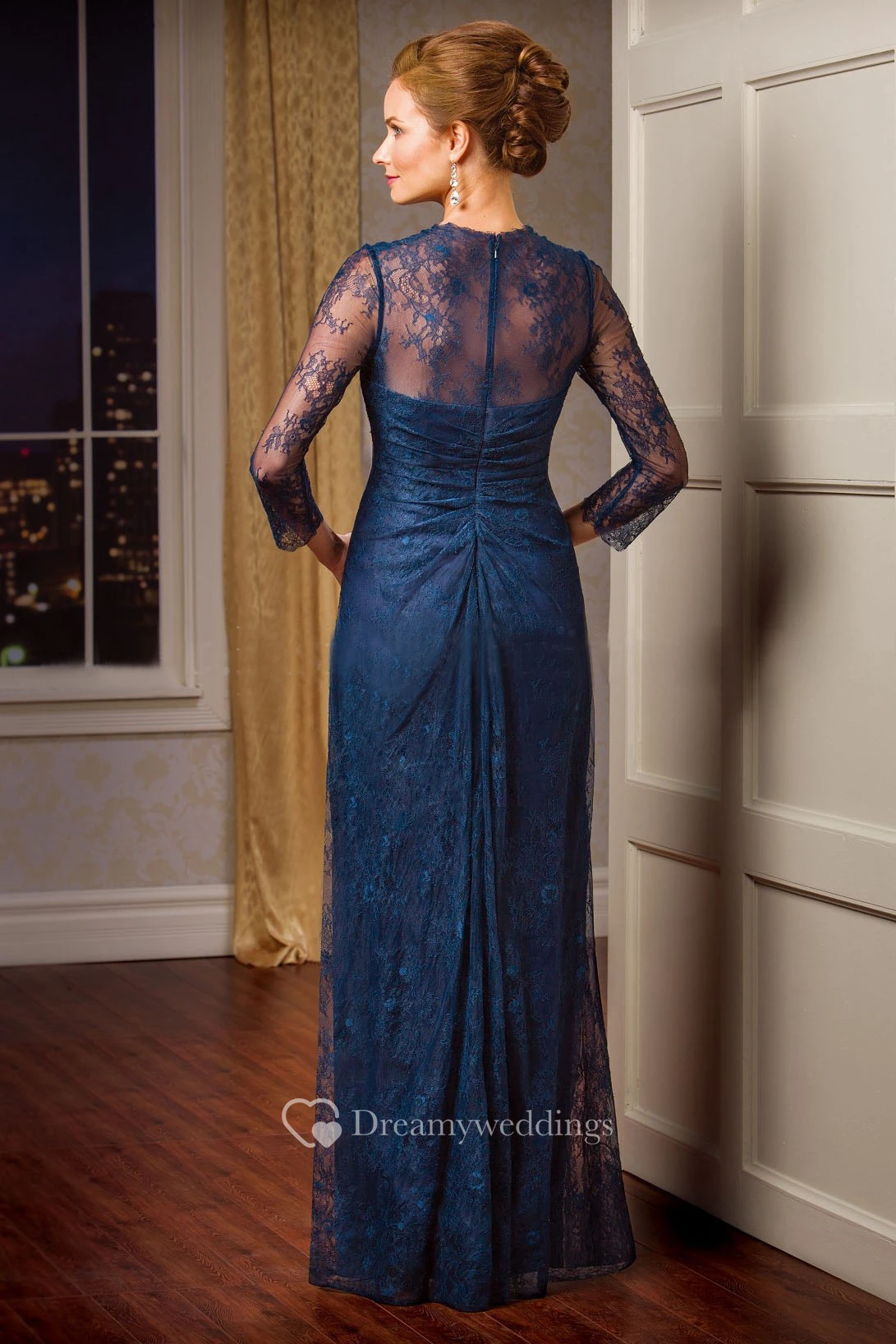 3-4 Sleeved V-Neck Lace Mother Of The Bride Dress With Crystals And Illusion Style