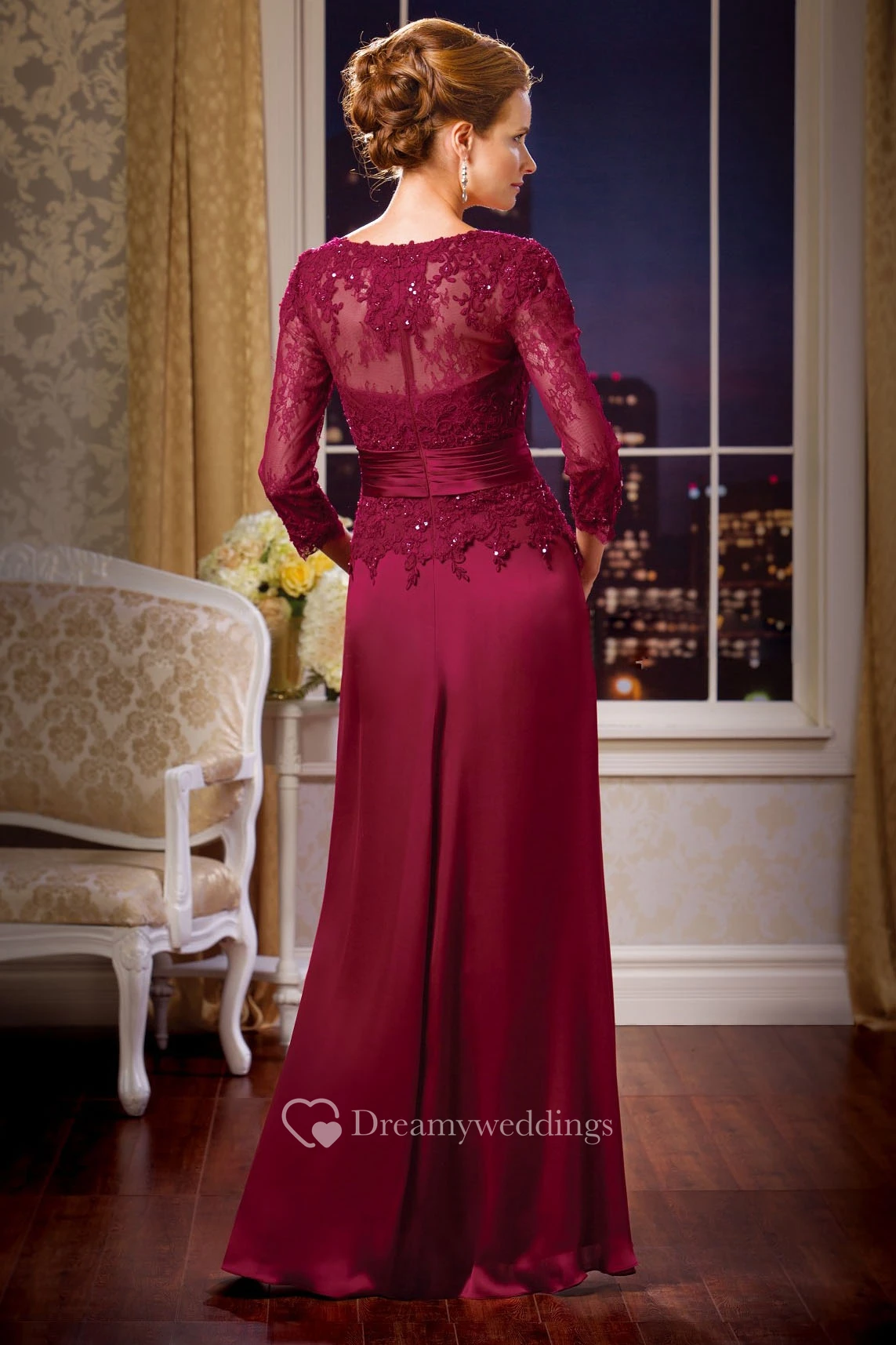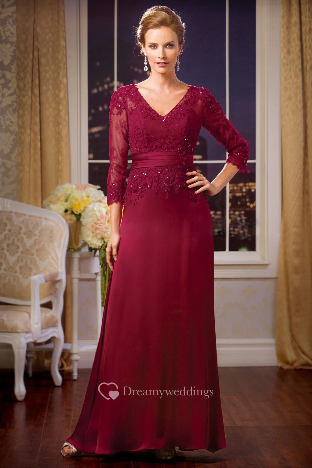 3-4 Sleeved V-Neck Long Mother Of The Bride Dress With Sequins And Appliques