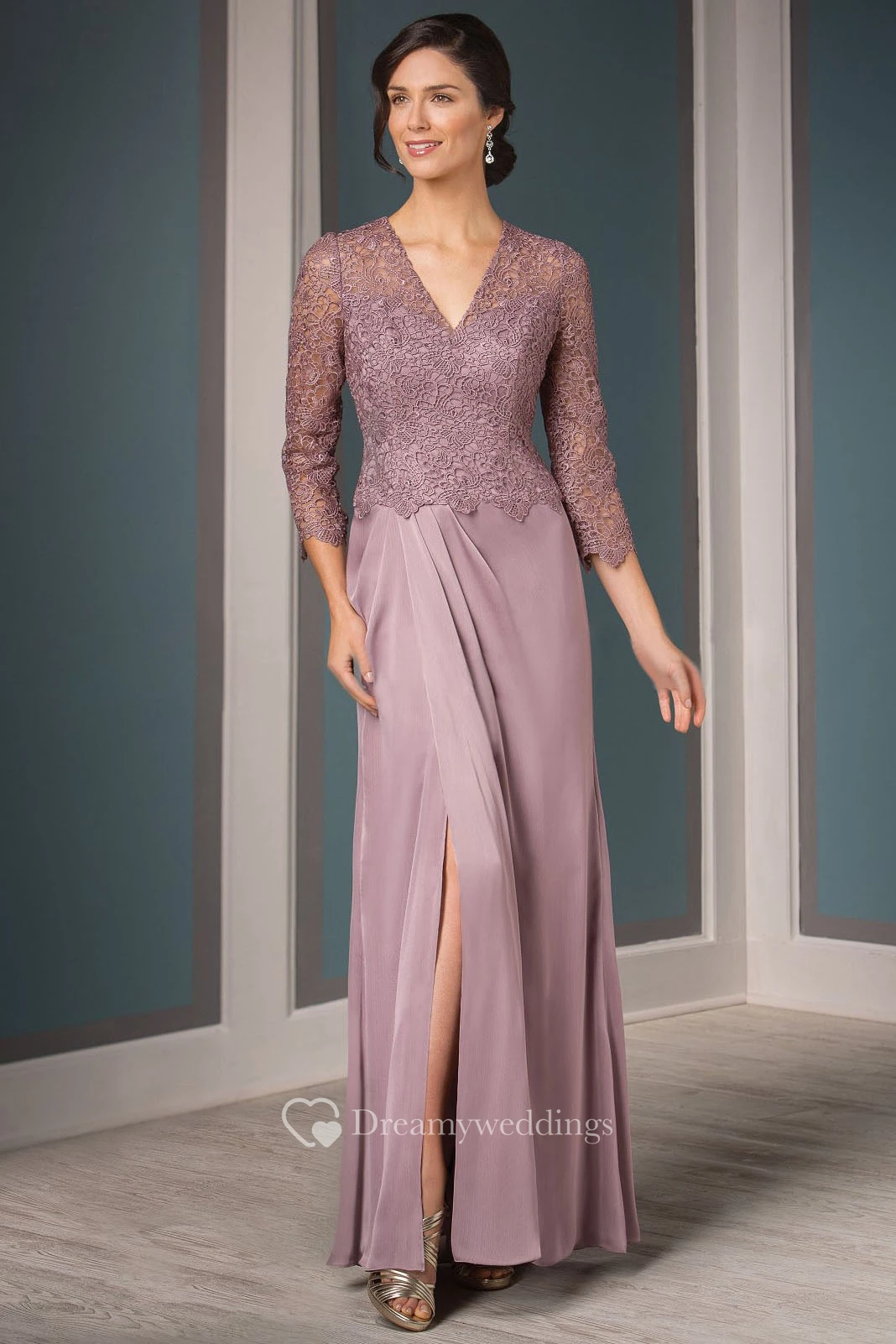 3-4 Sleeved V-Neck Mother Of The Bride Dress With Front Slit And Pleats