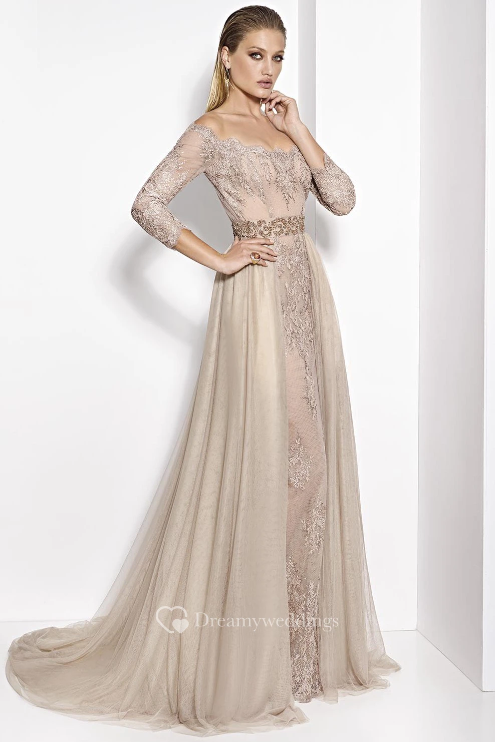 A-Line 3-4-Sleeve Appliqued Floor-Length Off-The-Shoulder Tulle&Lace Prom Dress With Waist Jewellery
