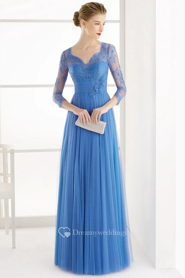 A-Line 3-4-Sleeve Lace V-Neck Floor-Length Tulle Prom Dress With Flower And Pleats