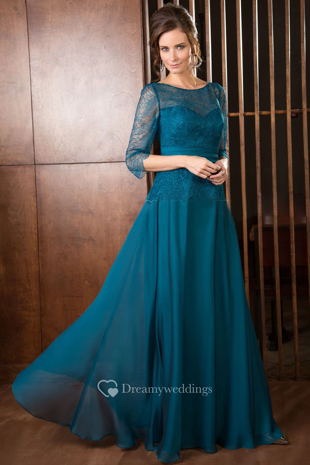 A-Line 3-4-Sleeve Maxi Scoop-Neck Lace Chiffon Mother Of The Bride Dress