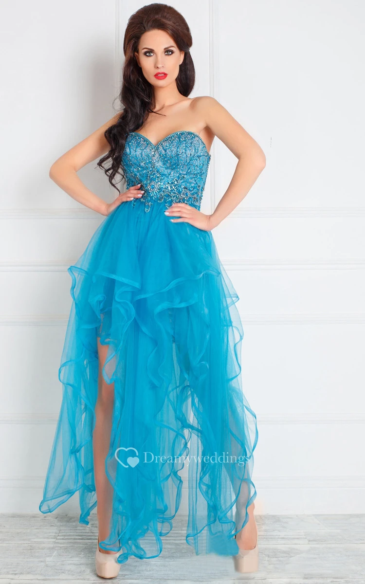 A-Line Anckle-Length Asymmetrical Train Sweetheart Sleeveless Tulle Beading Ruffles Backless Dress