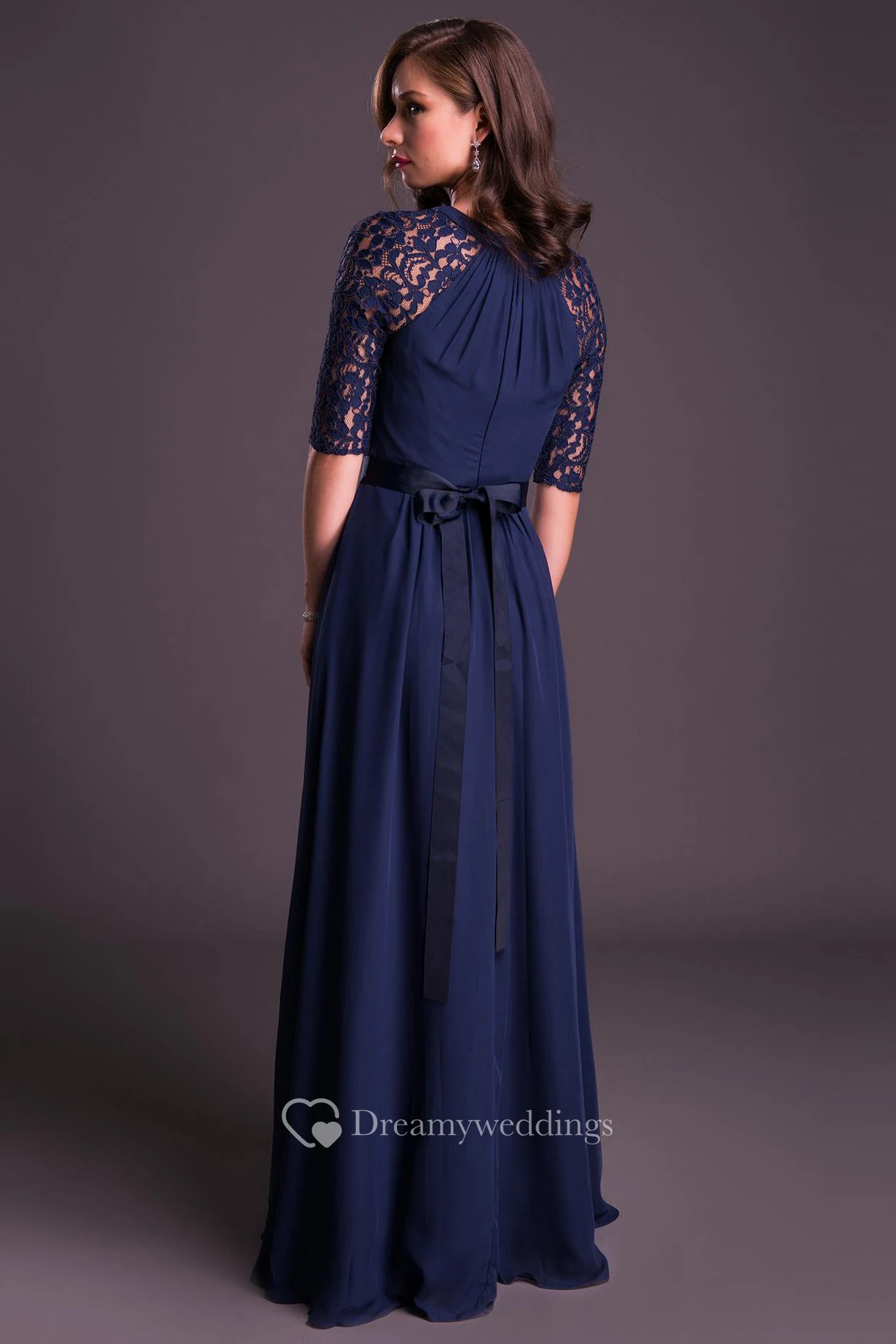 A-Line Appliqued Scoop-Neck Floor-Length Half-Sleeve Chiffon Prom Dress With Waist Jewellery And Bow
