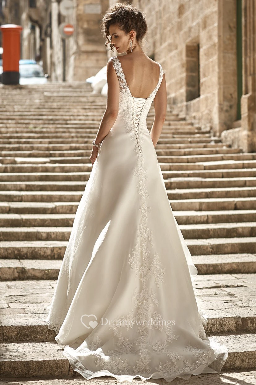 A-Line Appliqued V-Neck Long Sleeveless Satin&Lace Wedding Dress With Side Draping