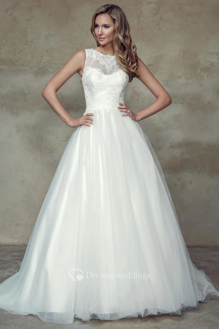 A-Line Ball-Gown Floor-Length Sleeveless Appliqued Scoop Lace&Satin Wedding Dress With Court Train And Illusion Back