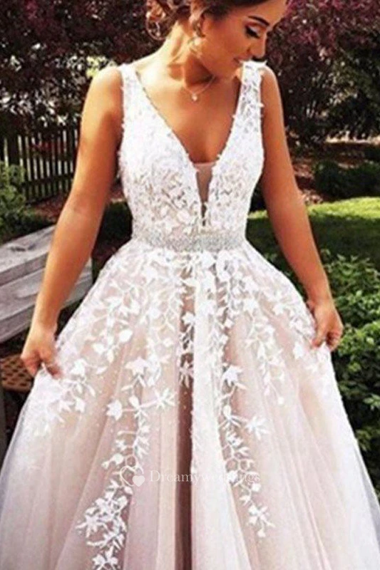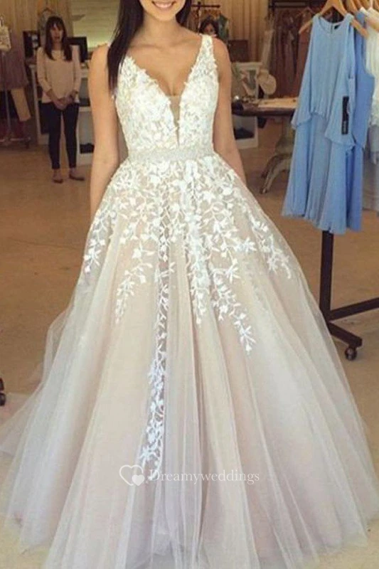 A-Line Ball Gown Lace Tulle V-neck Sleeveless Zipper Low-V Back Dress