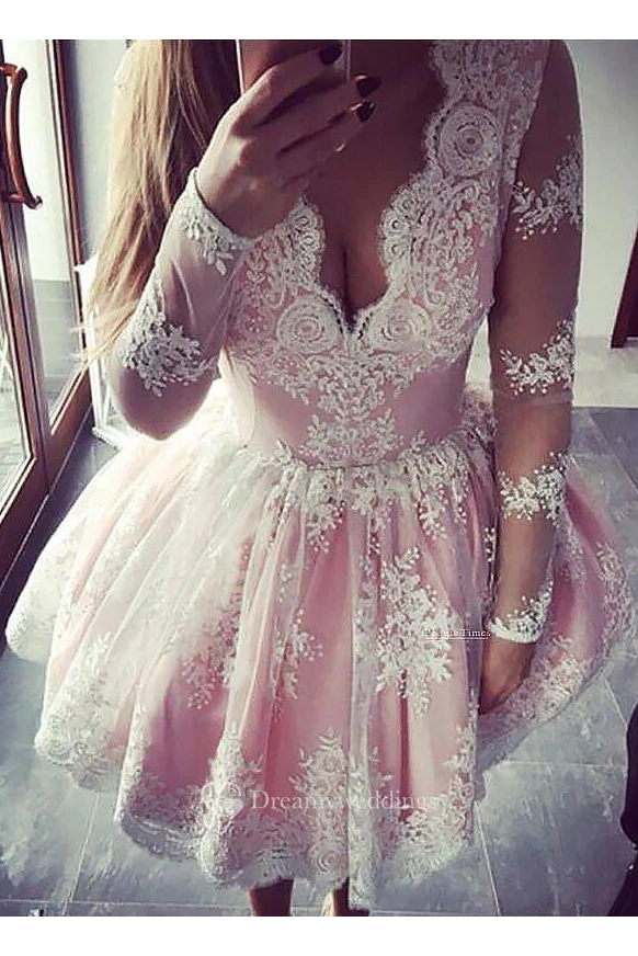 A-line Ball Gown Long Sleeve Lace Scalloped V-neck Zipper Short Mini Homecoming Dress