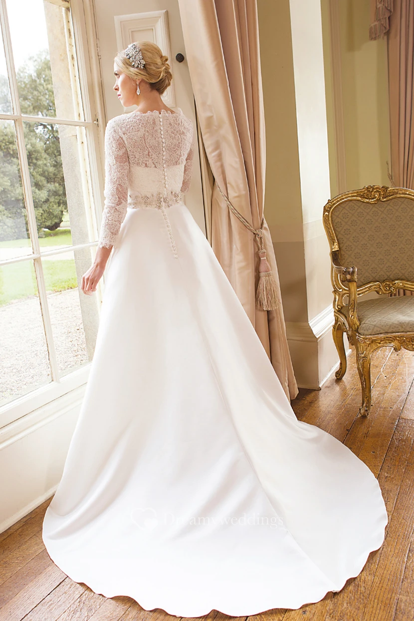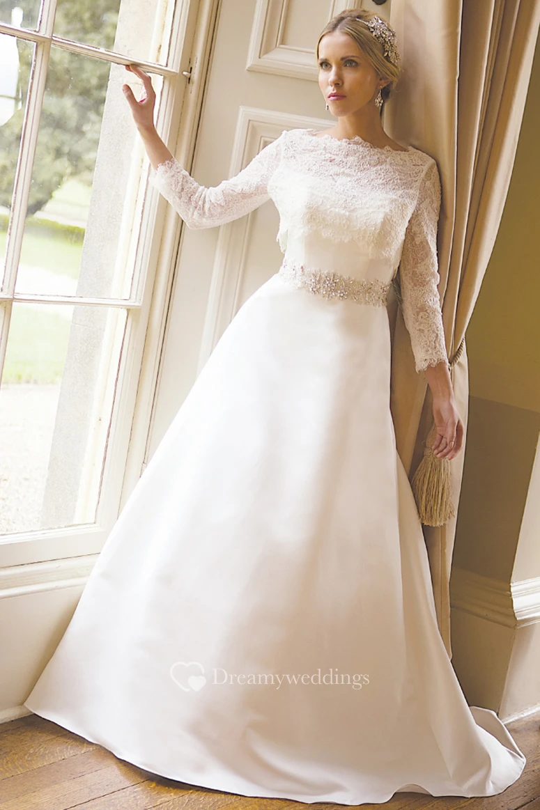 A-Line Bateau Neck Appliqued Long Sleeve Satin Wedding Dress
