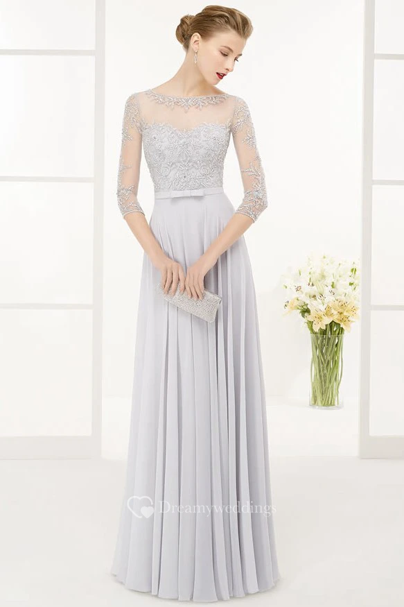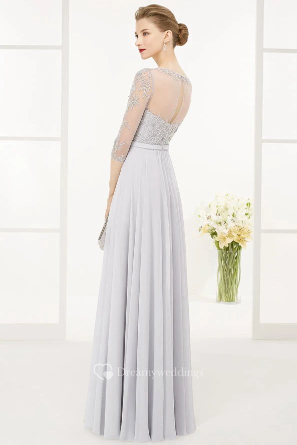 A-Line Beaded 3-4-Sleeve Floor-Length Jewel-Neck Chiffon Prom Dress