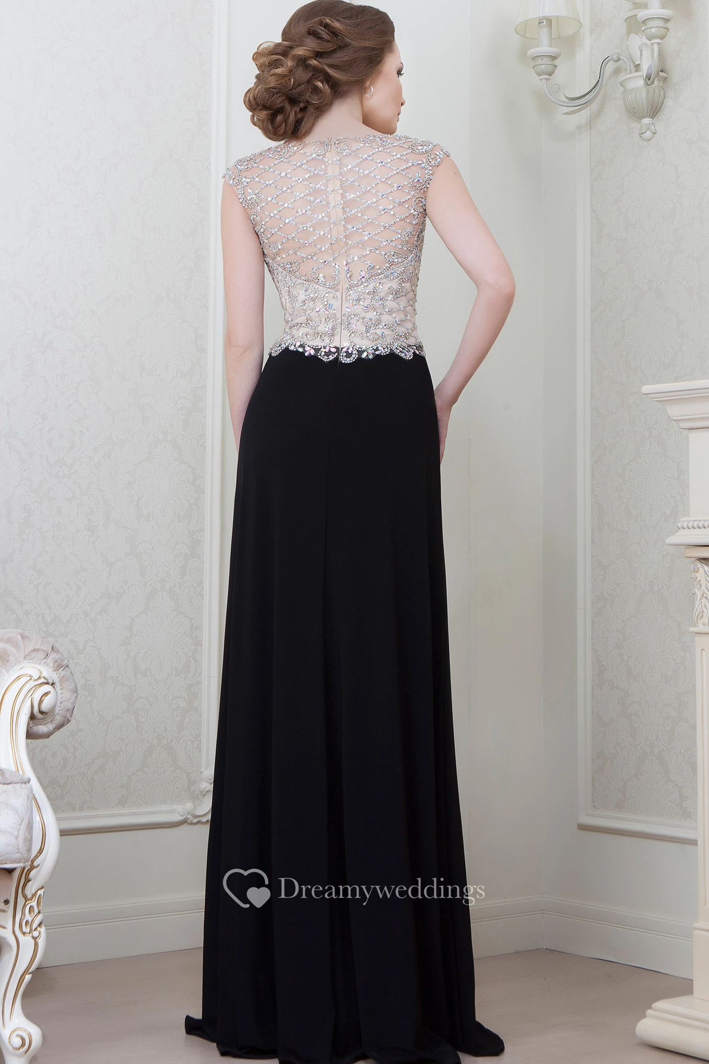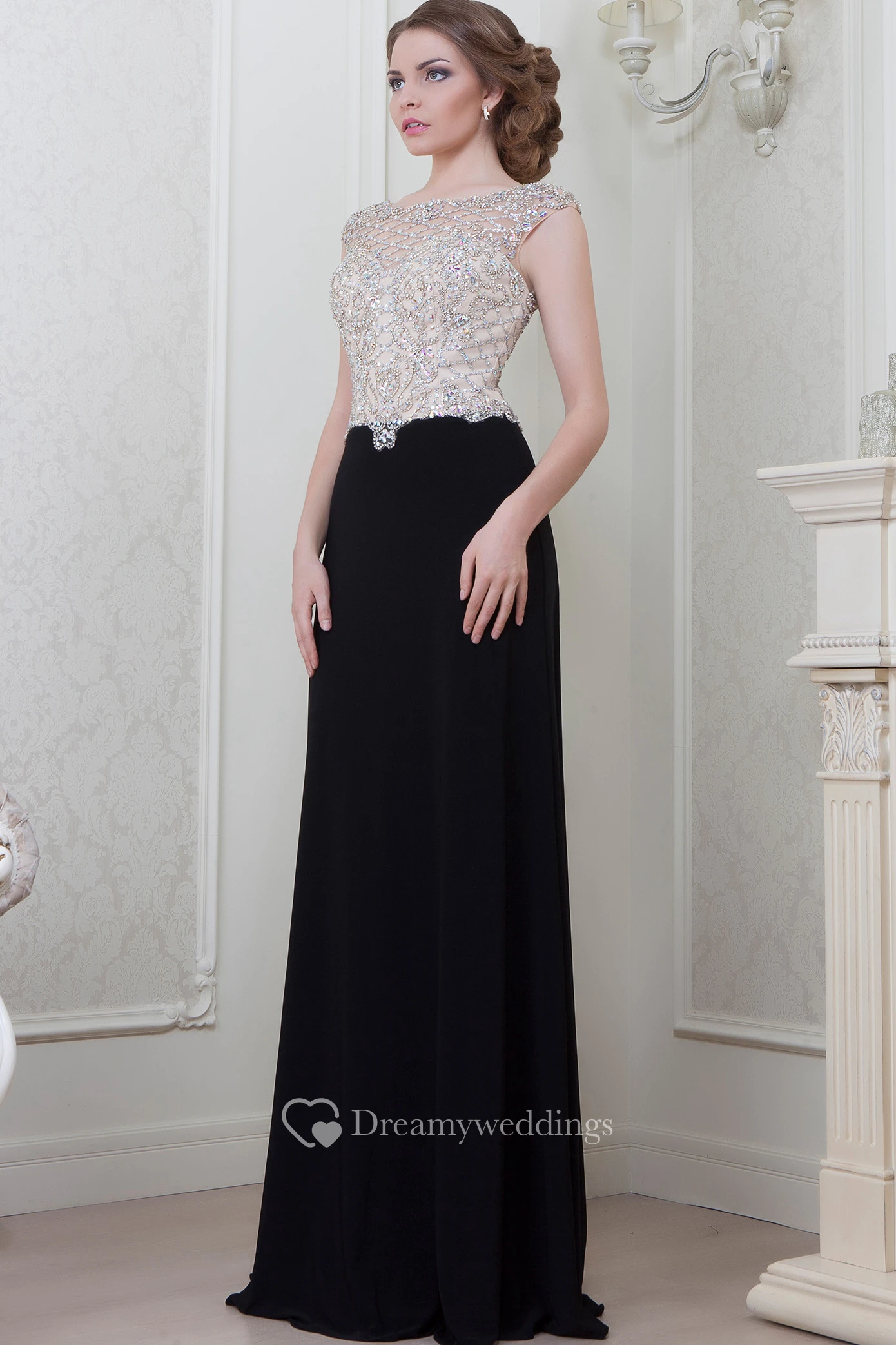 A-Line Beaded Cap-Sleeve Bateau-Neck Floor-Length Jersey Evening Dress