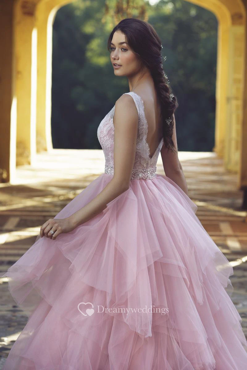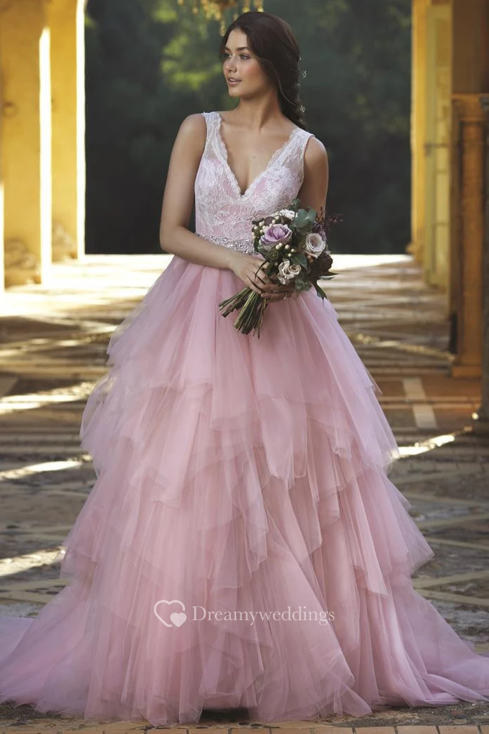 A-Line Cascading-Ruffle Sleeveless V-Neck Floor-Length Tulle Wedding Dress With Lace And Waist Jewellery