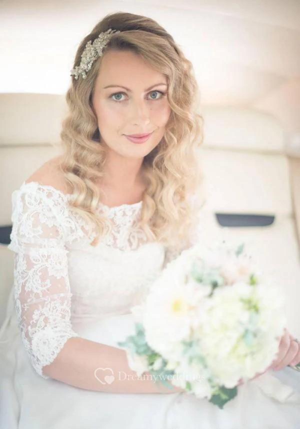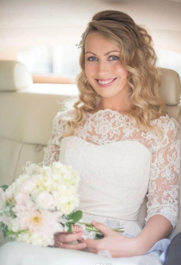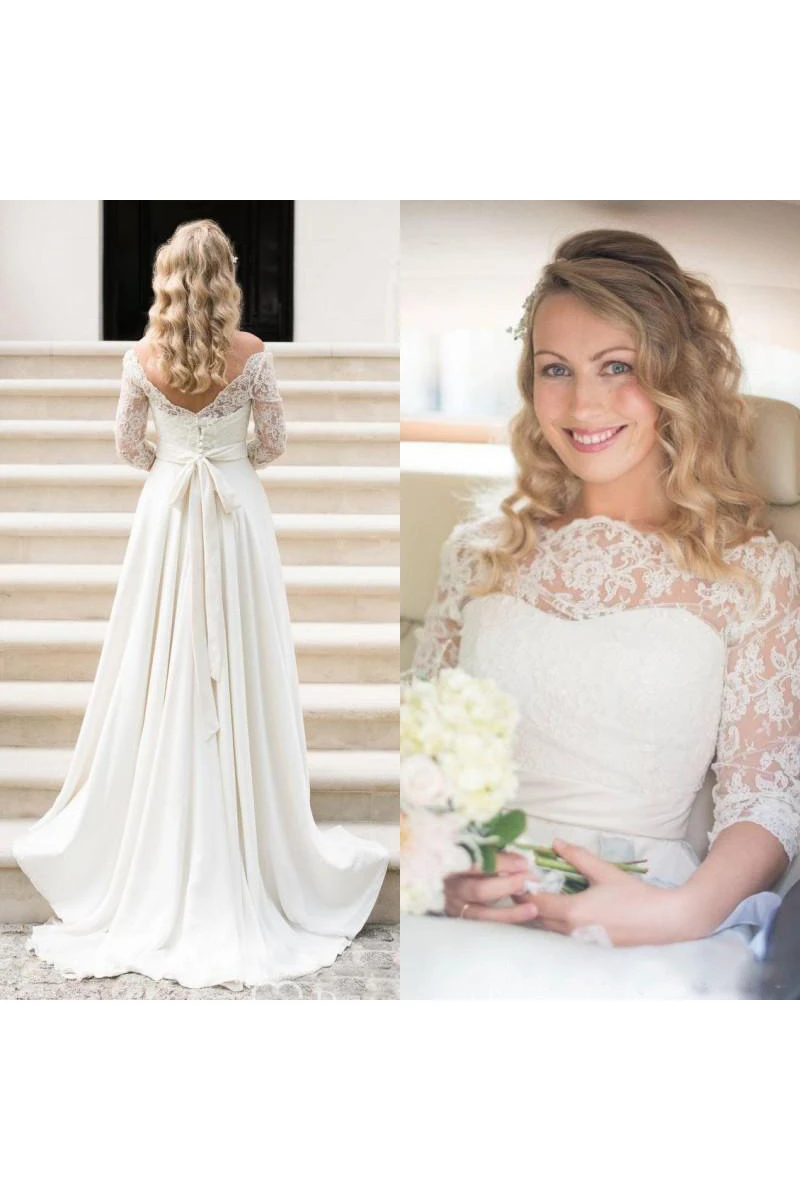 A Line Country Illusion Lace Bateau Neck V Back Zipper up Wedding Dress with Sleeves
