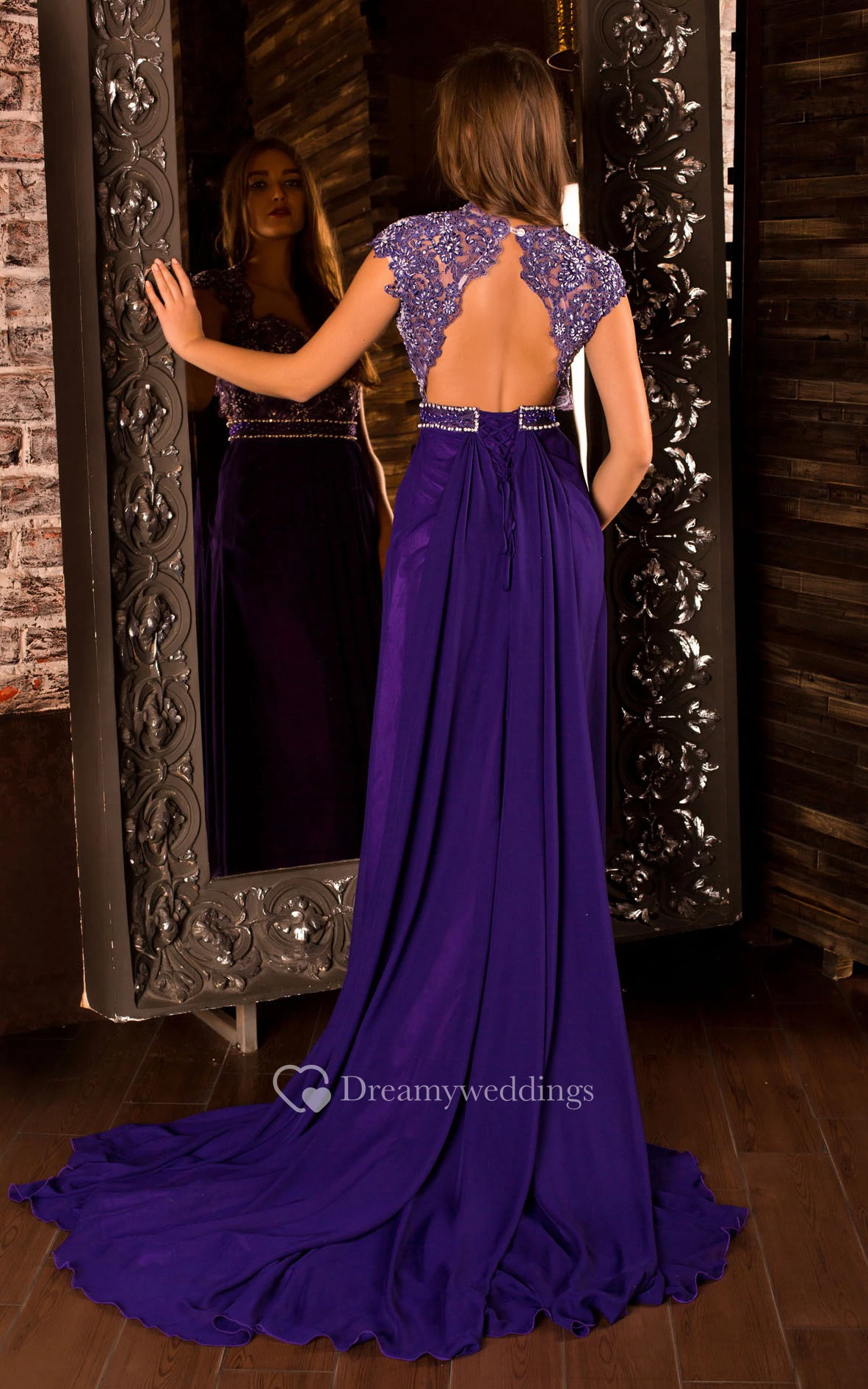 A-Line Court Train V-Neck Short Sleeve Jersey Beading Appliques Keyhole Dress