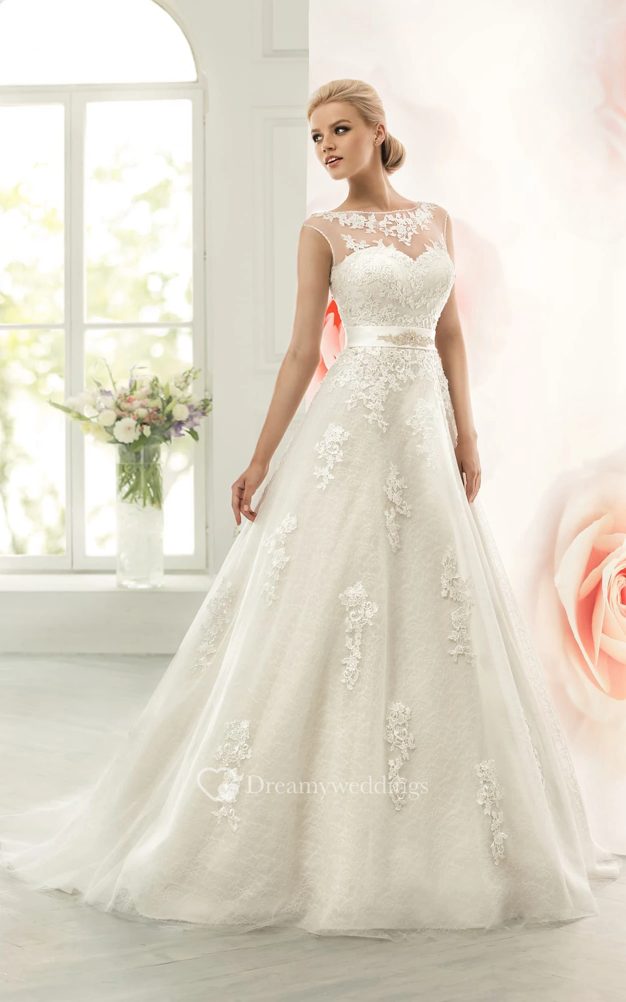 A-Line Floor-Length Bateau Cap-Sleeve Corset-Back Lace Dress With Appliques And Waist Jewellery