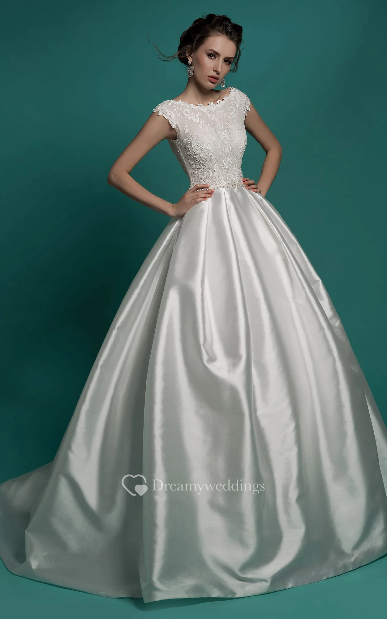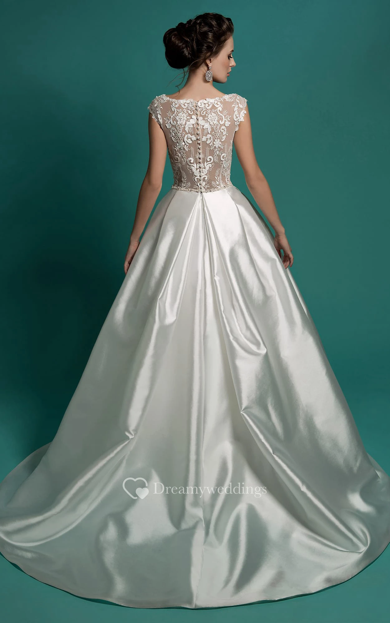 A-Line Floor-Length Bateau-Neck Cap-Sleeve Zipper Satin Dress With Appliques And Beading
