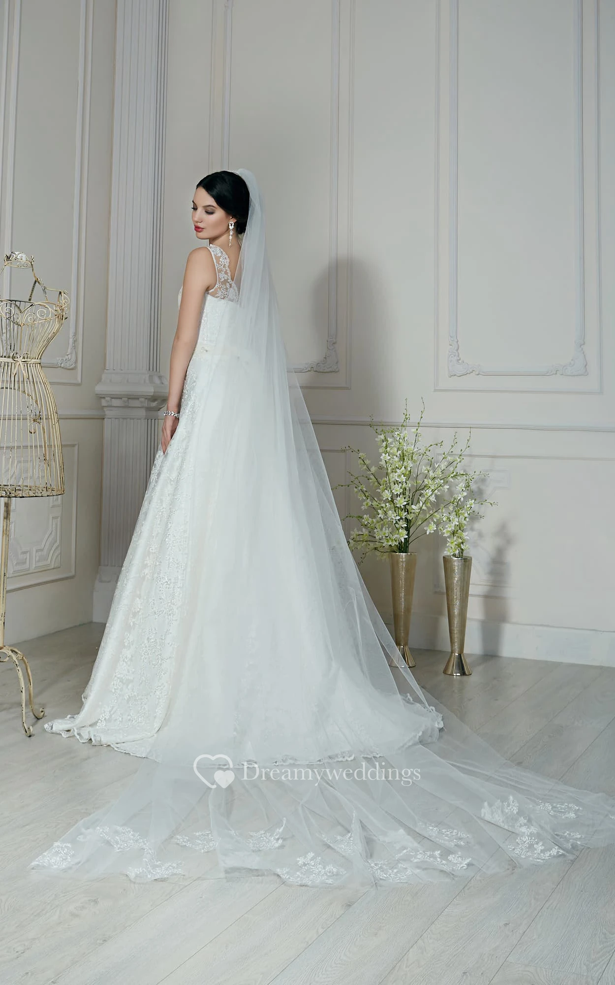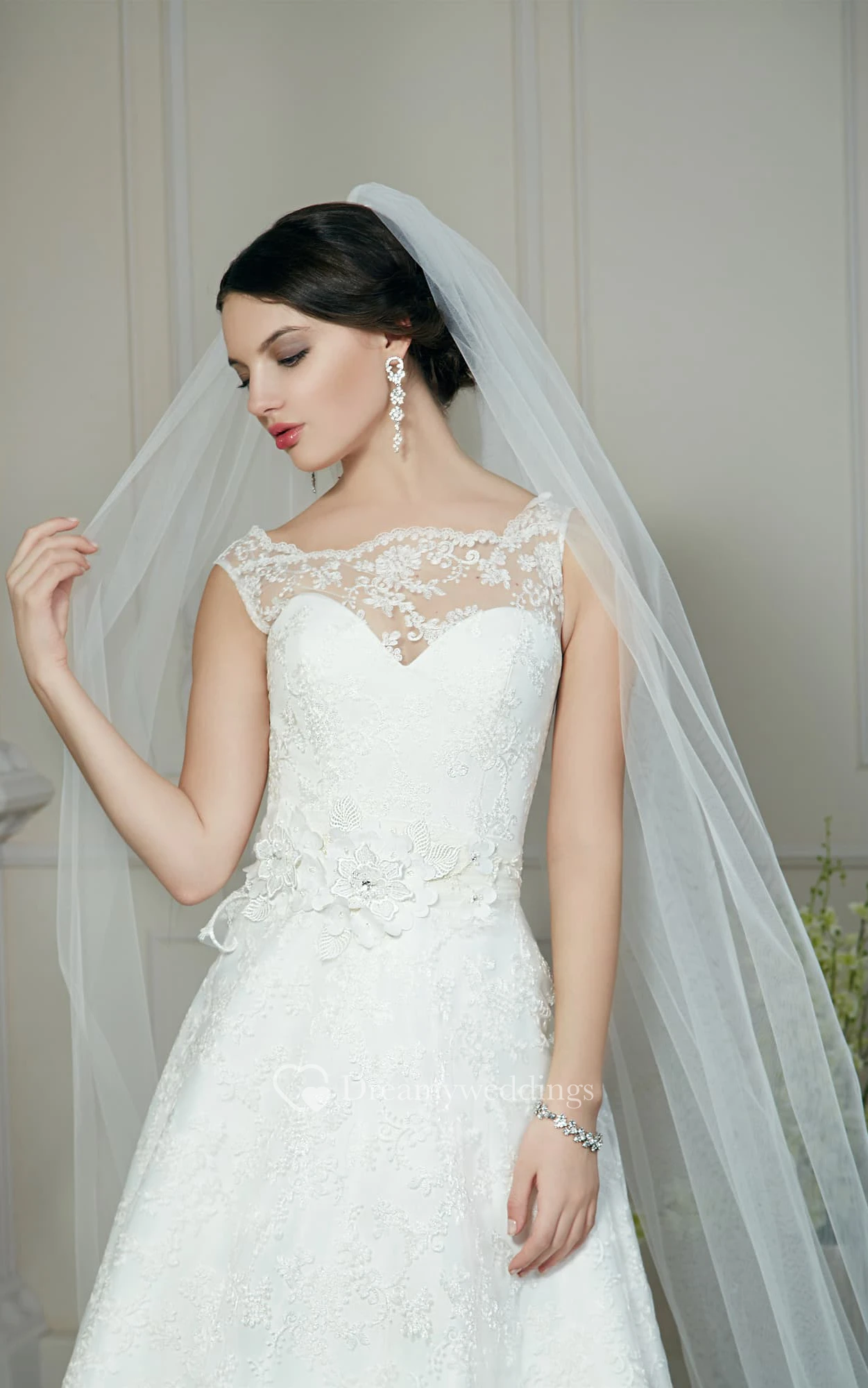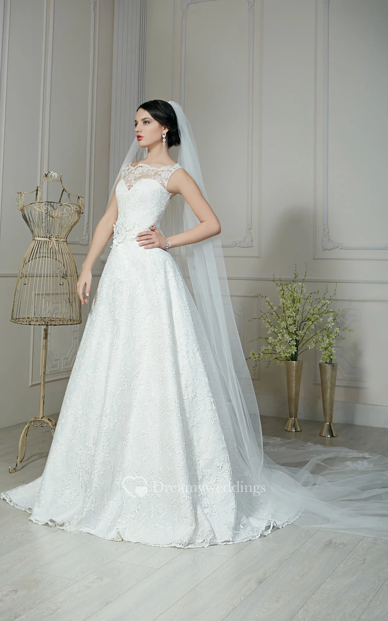 A-Line Floor-Length Bateau-Neck Sleeveless Corset-Back Lace Dress With Flower
