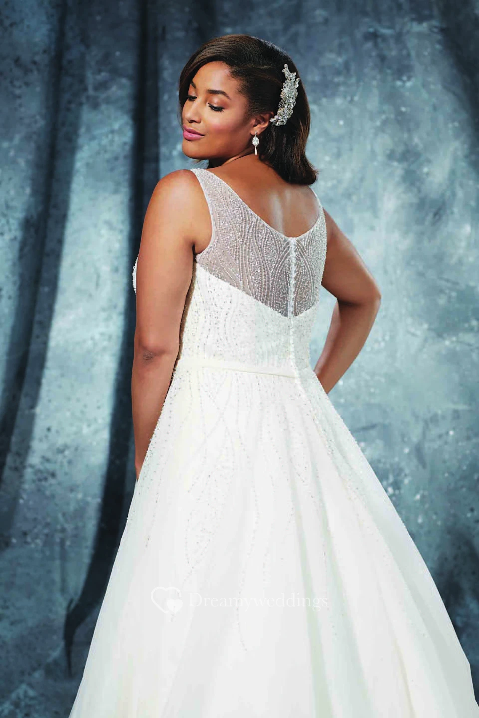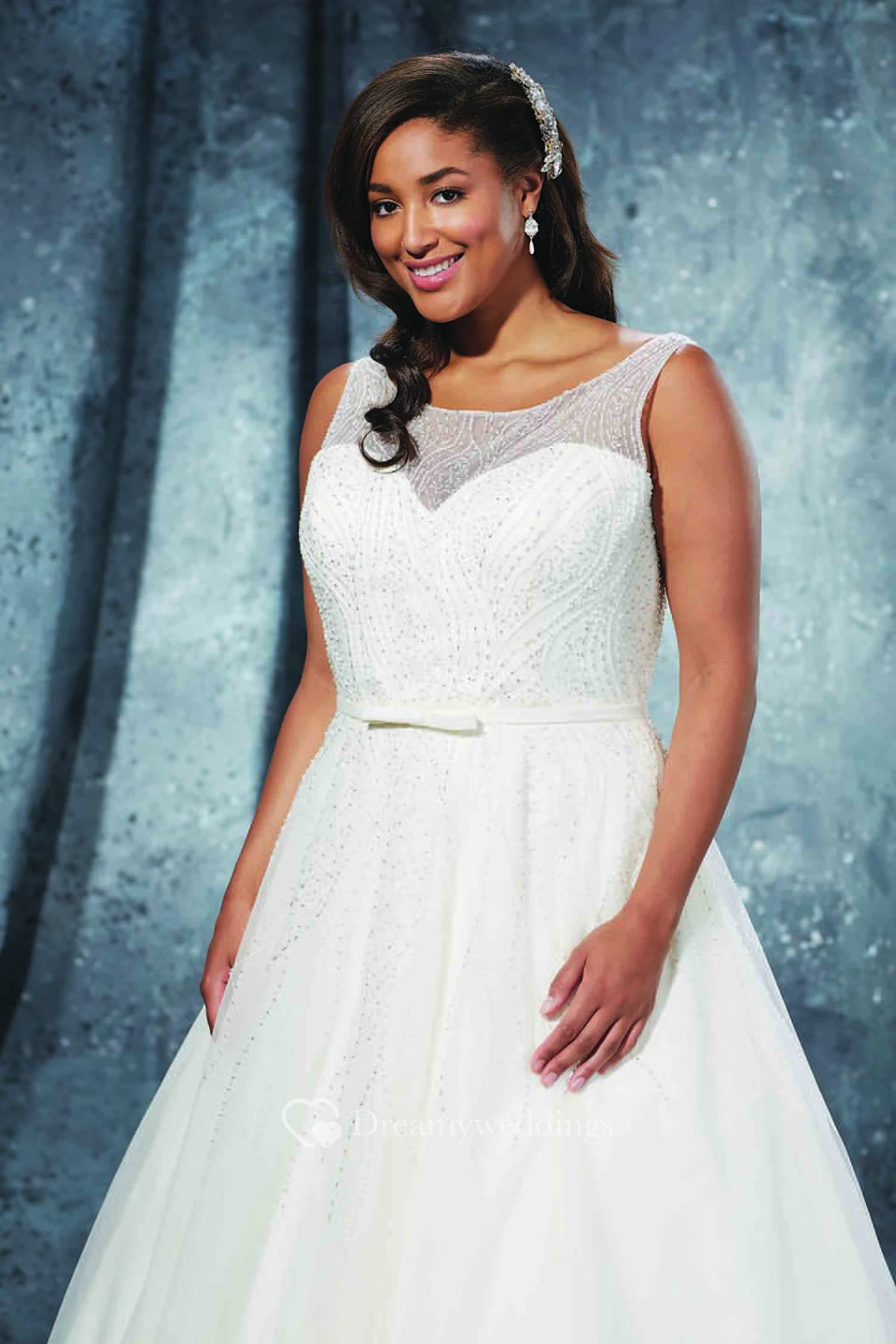 A-Line Floor-Length Bateau Neck Sleeveless Tulle Court Train Illusion Beading Dress