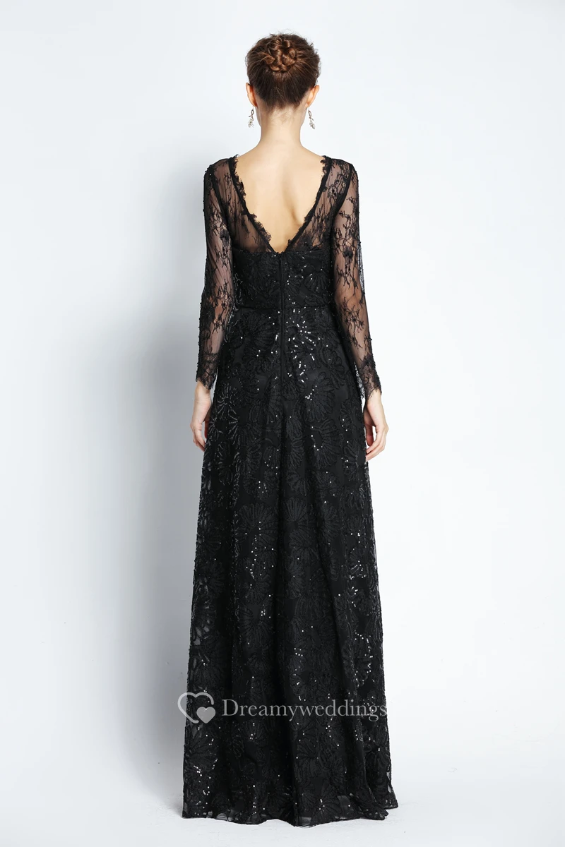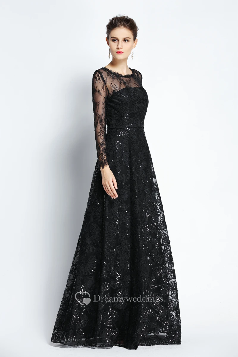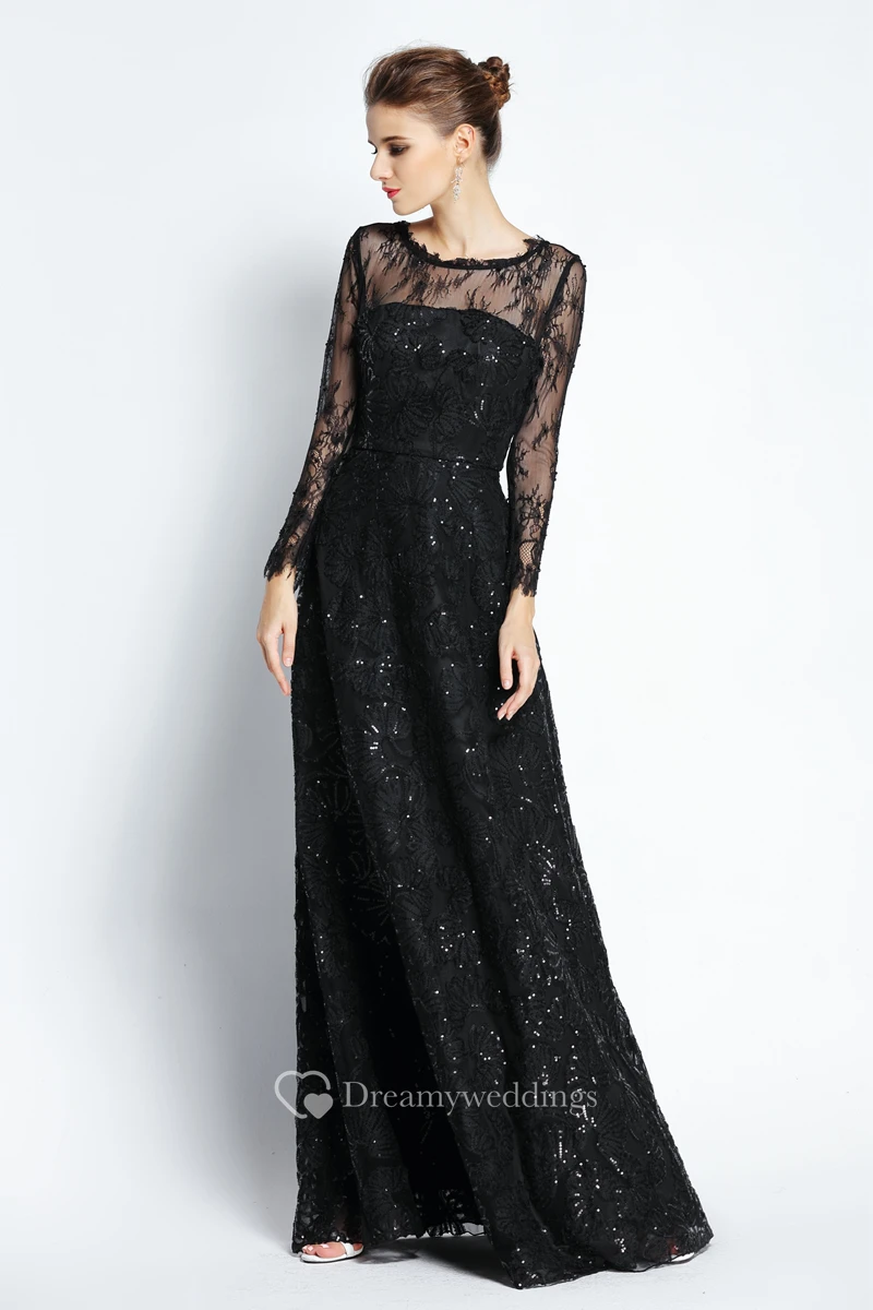 A-Line Floor-length Bateau Scalloped Lace Long Sleeve Prom Dress with Sequins