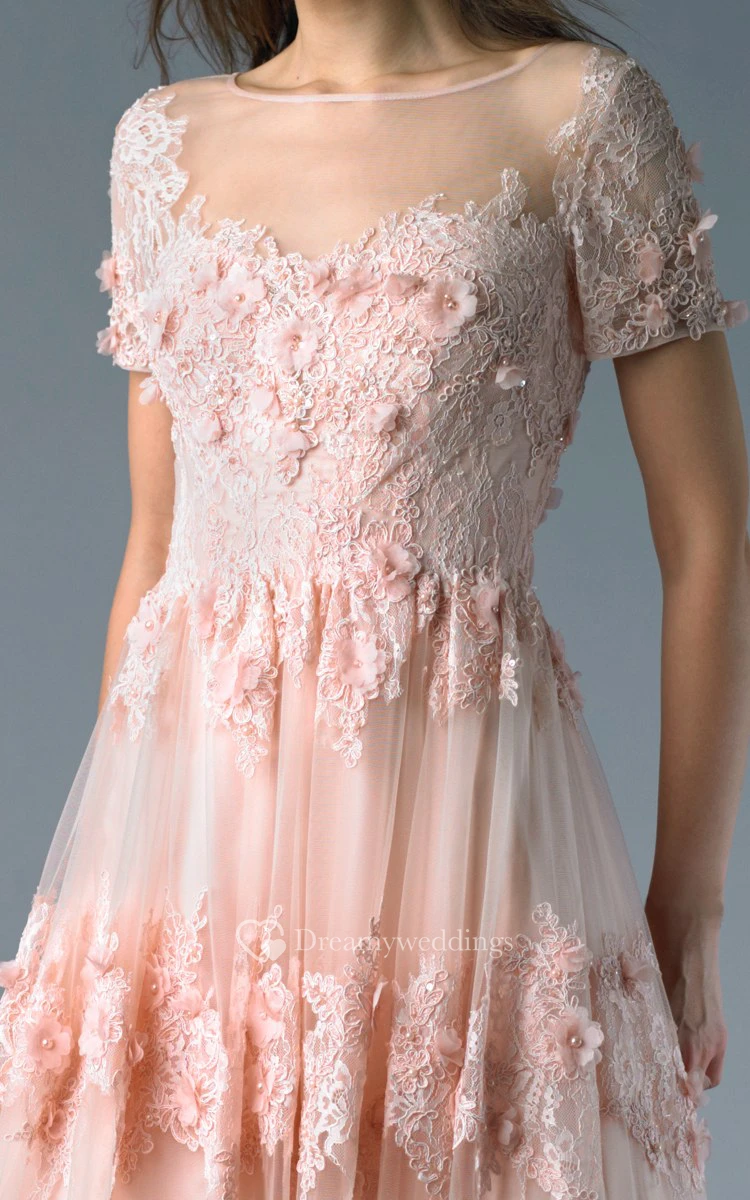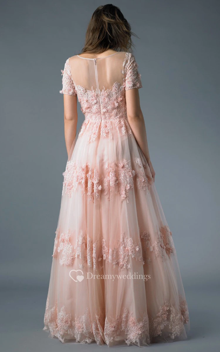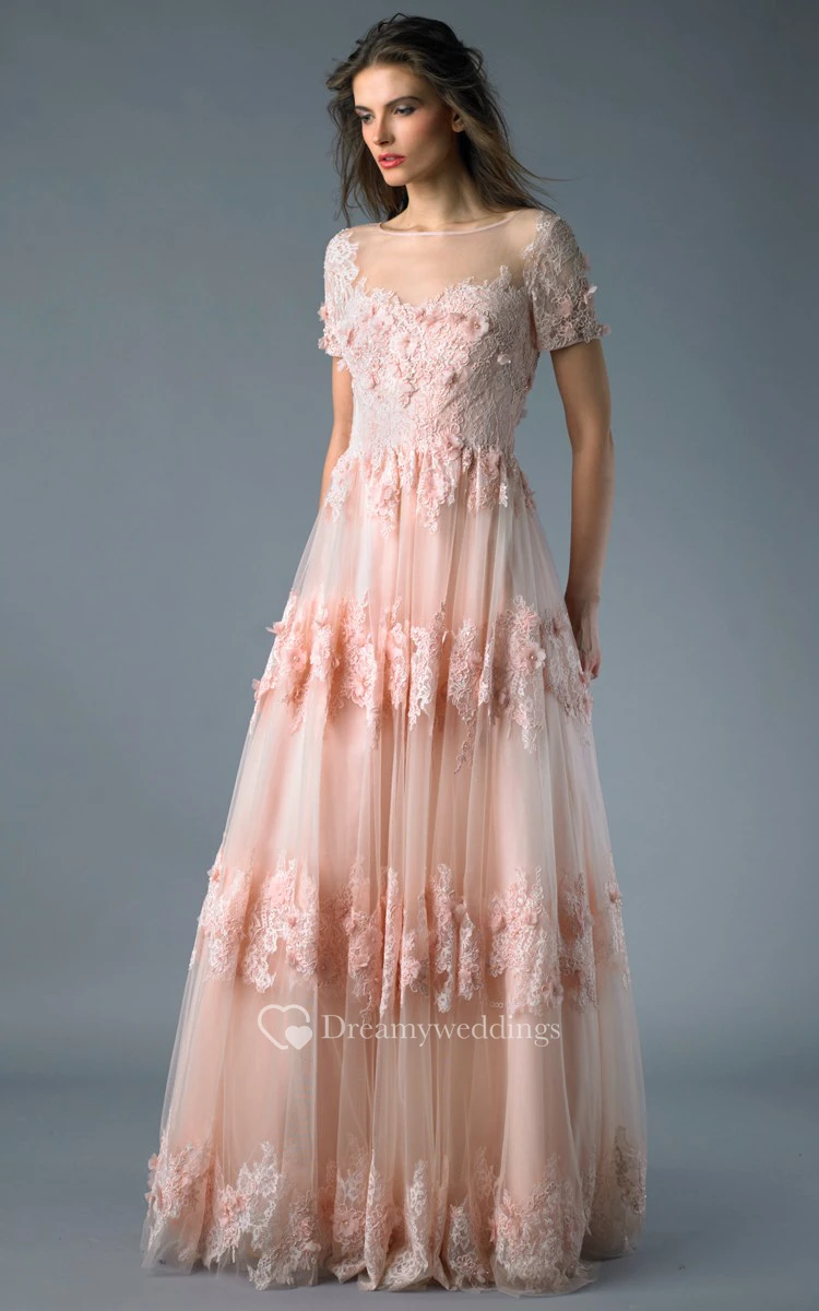 A-line Floor-length Bateau Short Sleeve Lace Zipper Dress
