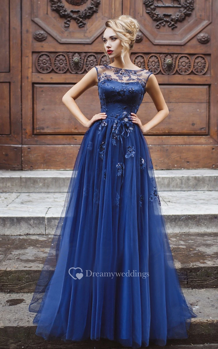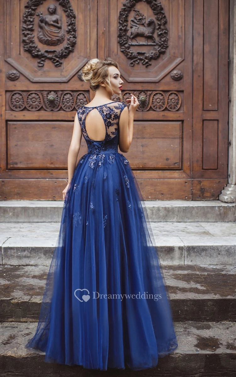 A-Line Floor-Length Bateau Short Sleeve Tulle Pleats Appliques Keyhole Dress