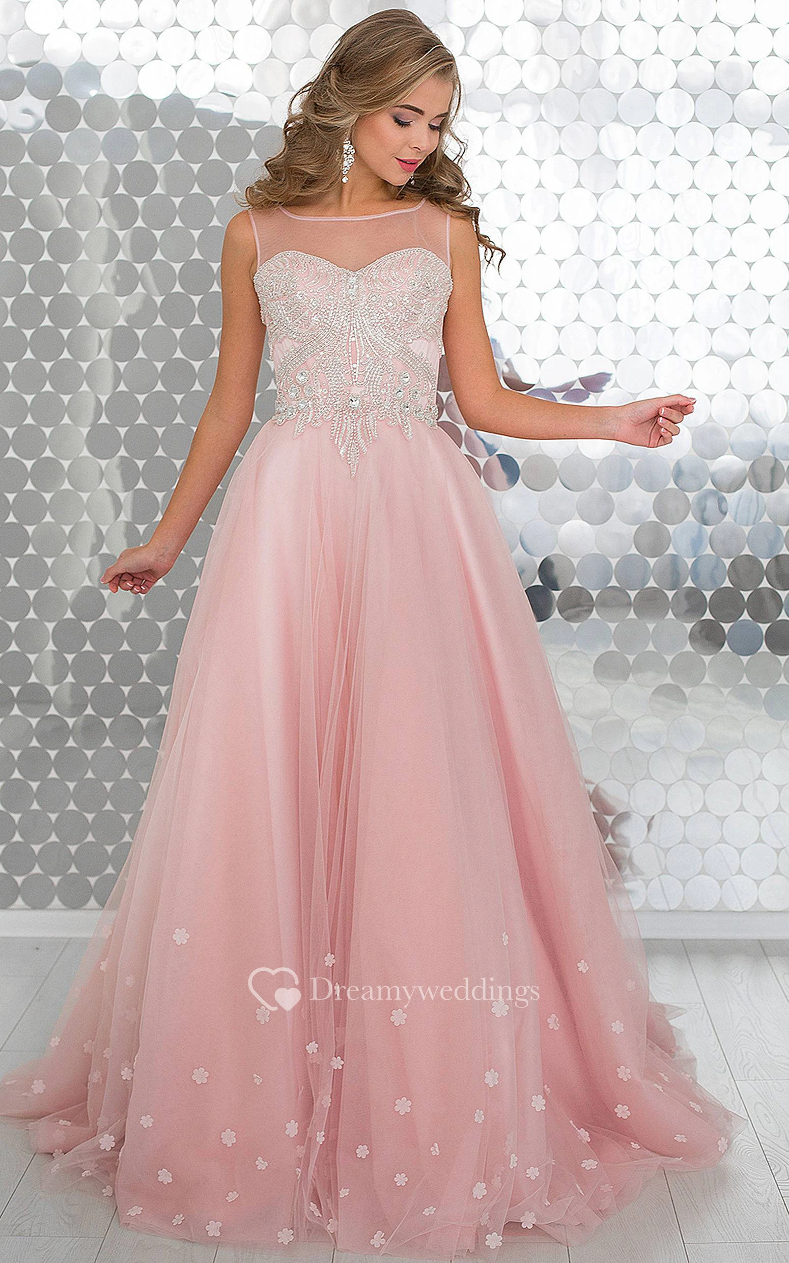 A-Line Floor-Length Bateau Sleeveless Tulle Beading Pleats Button Dress