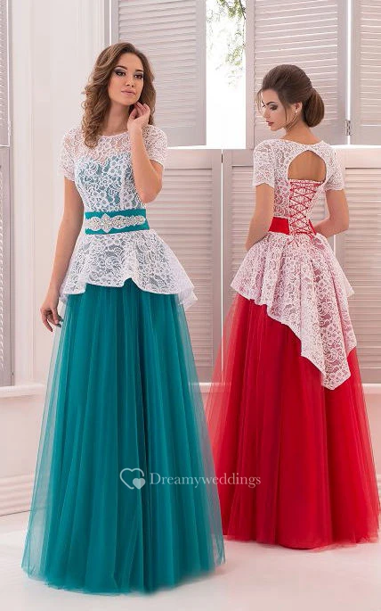 A-Line Floor-Length High-Neck Short Sleeve Lace Crystal Detailing Sash Lace-Up Dress