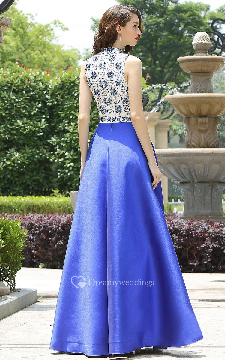 A-Line Floor-Length High-Neck Sleeveless Taffeta Beading Zipper Dress
