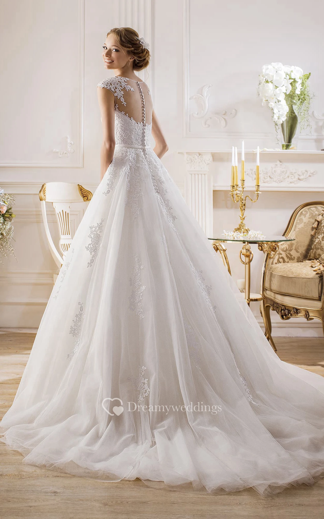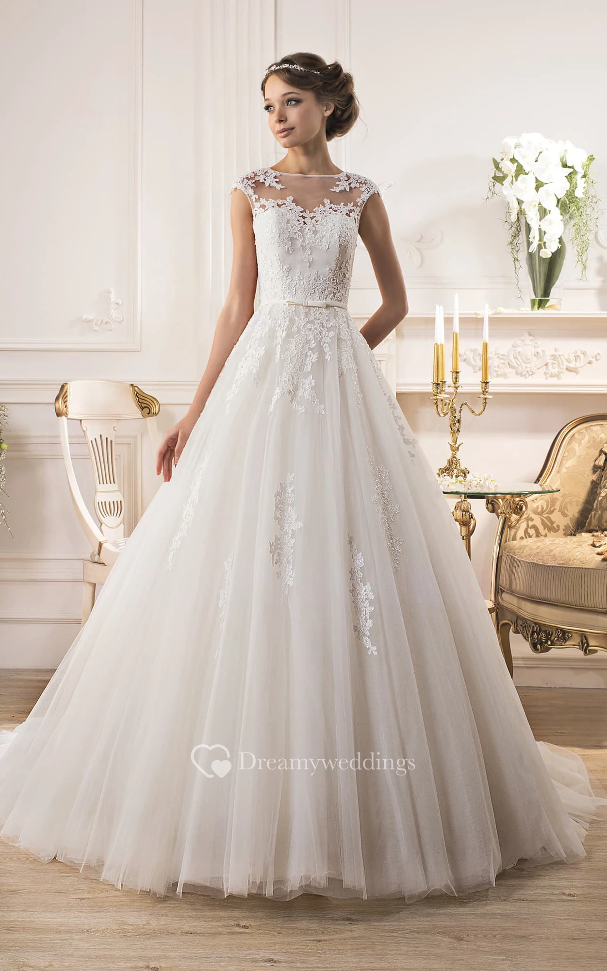 A-Line Floor-Length Jewel Cap-Sleeve Illusion Tulle Dress With Appliques And Pleats