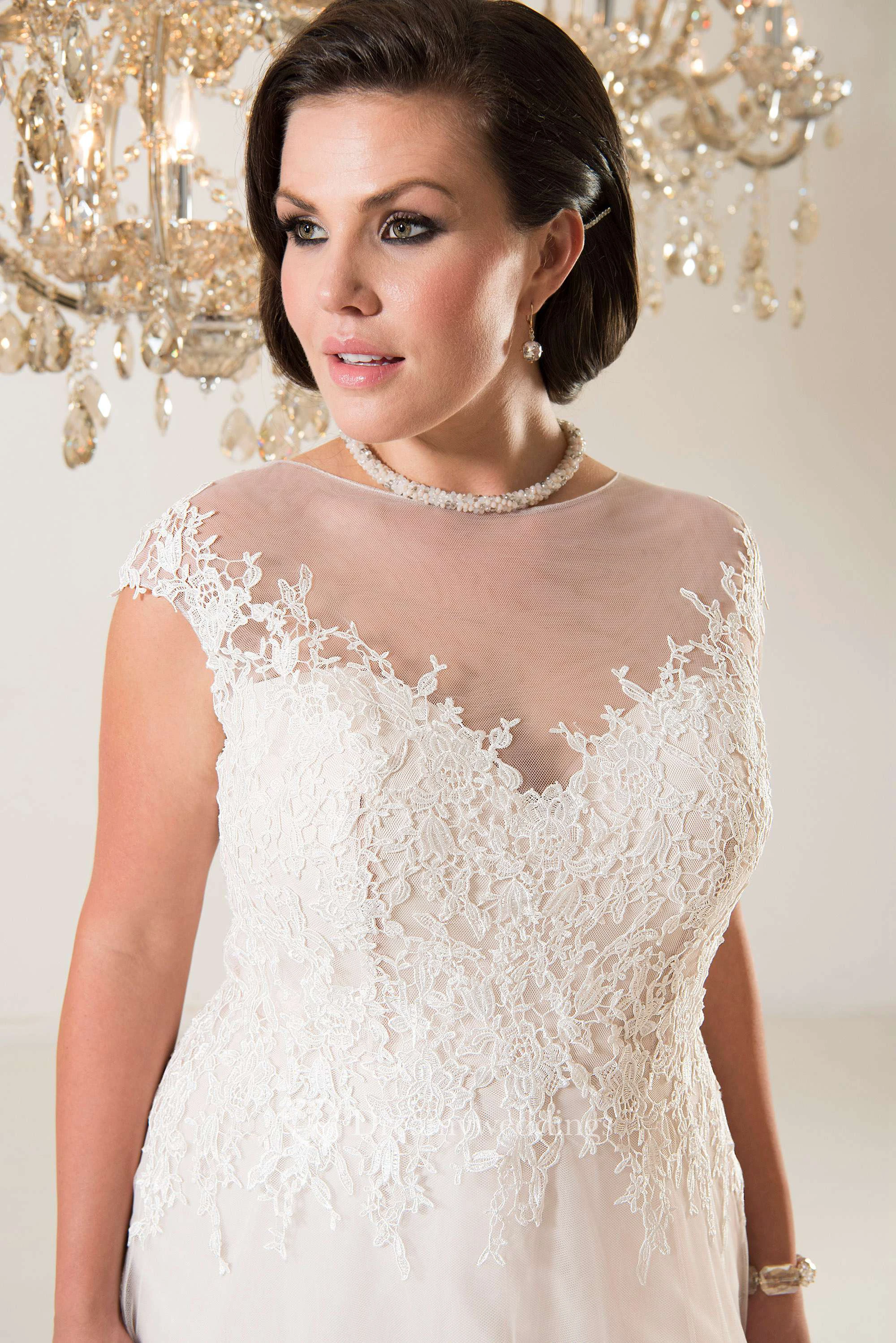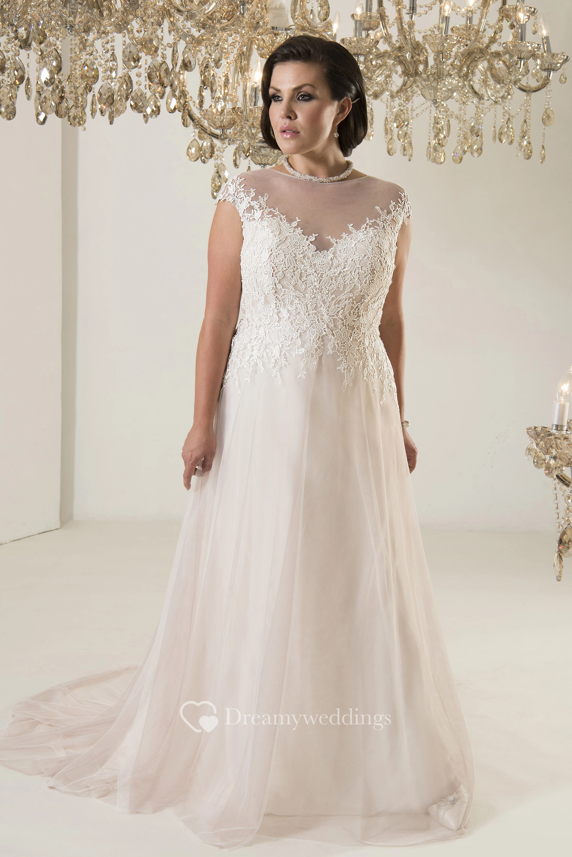A-Line Floor-Length Jewel Neck Cap Tulle Chapel Train Illusion Appliques Dress