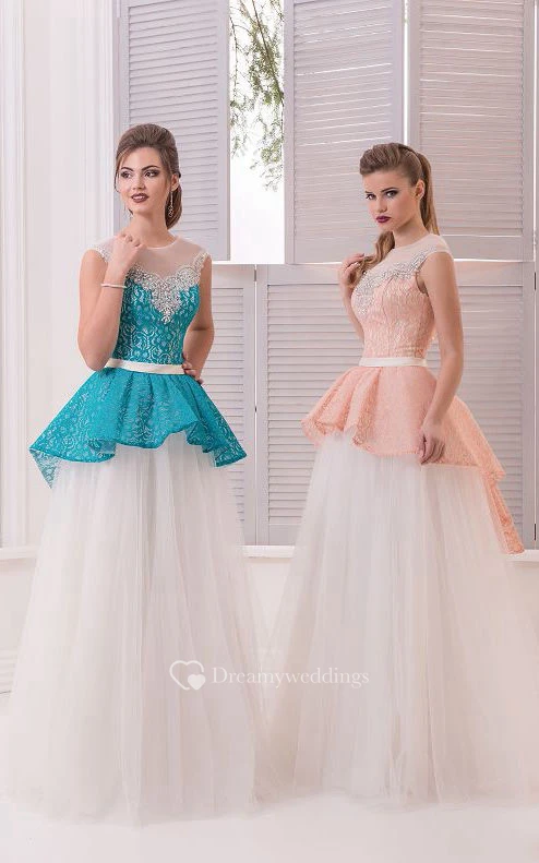 A-Line Floor-Length Jewel Short Sleeve Tulle Beading Lace Zipper Dress
