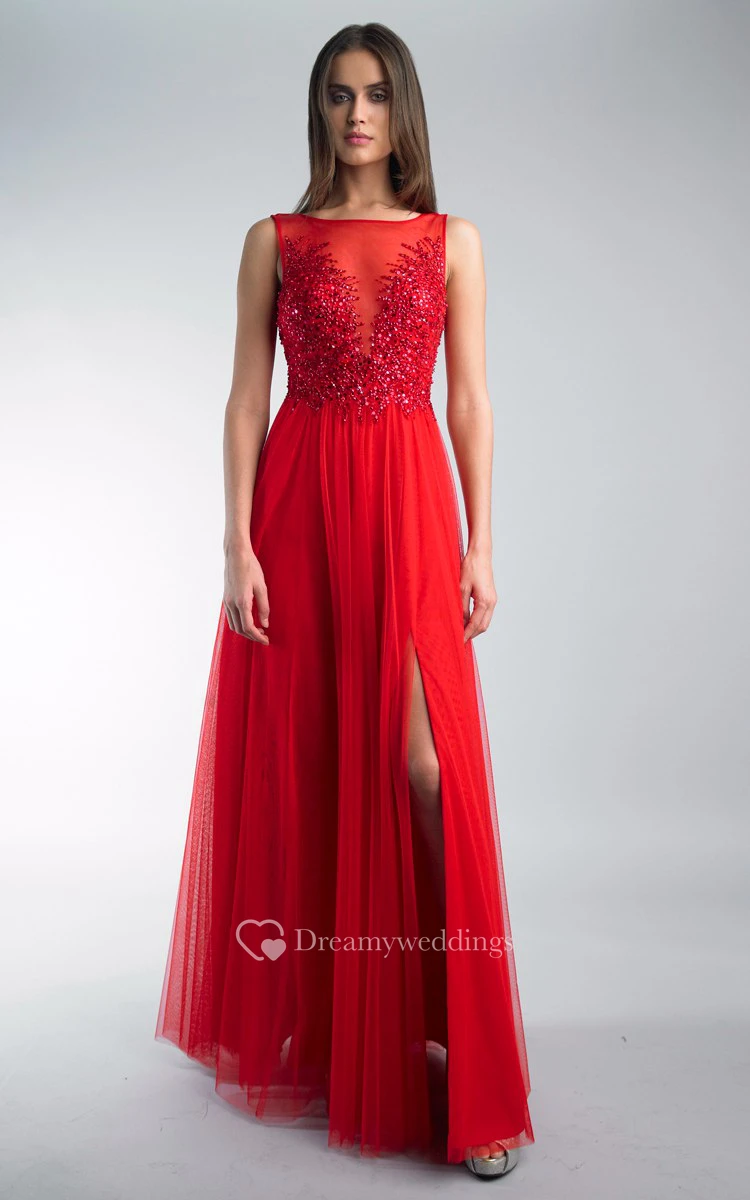 A-line Floor-length Jewel Sleeveless Tulle Low-V Back Dress