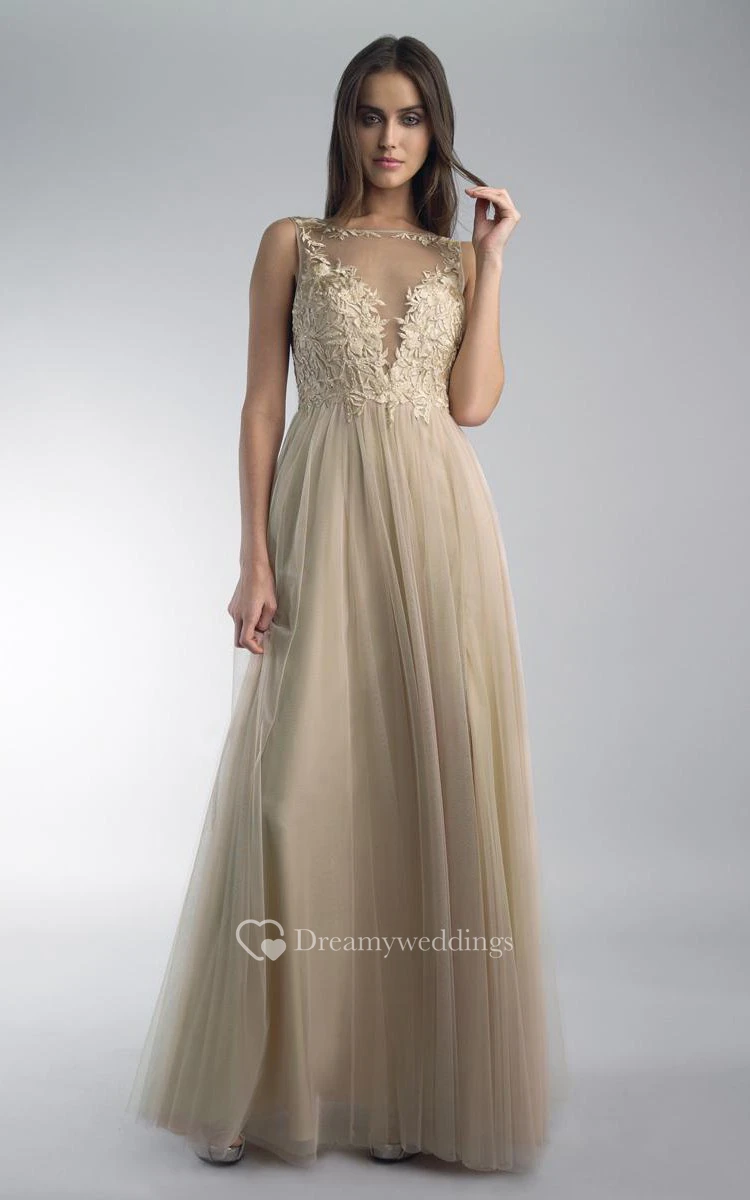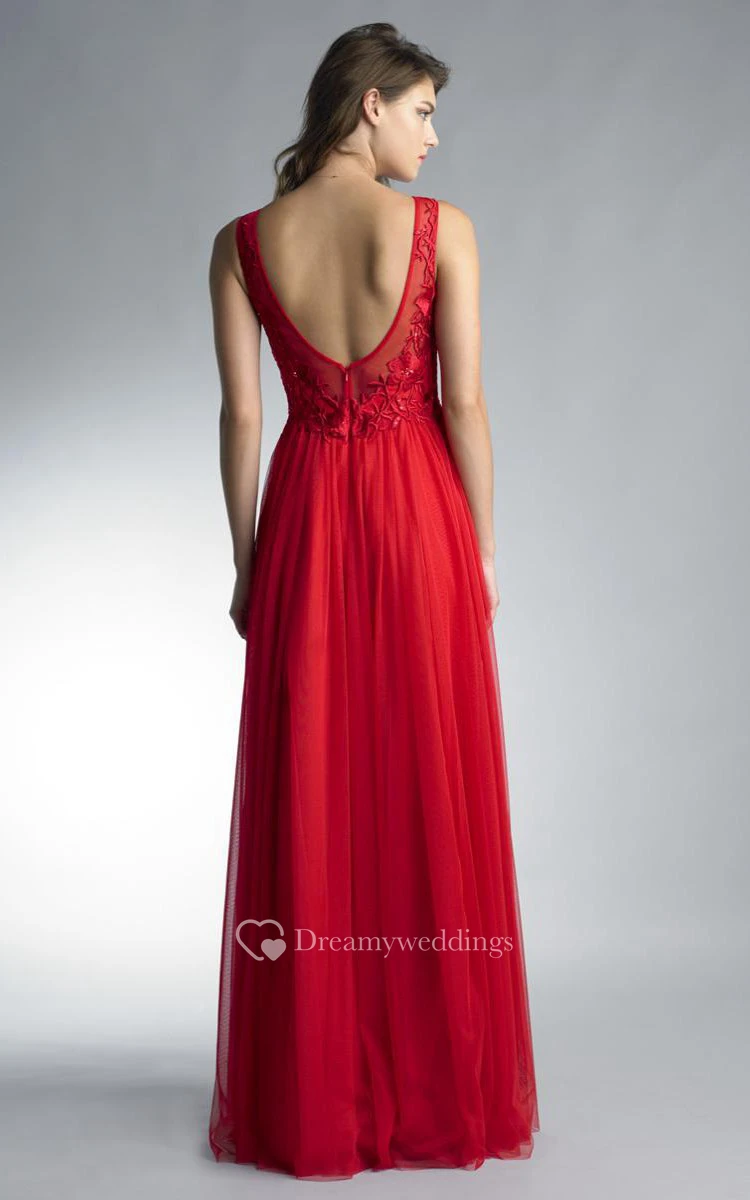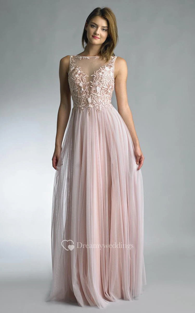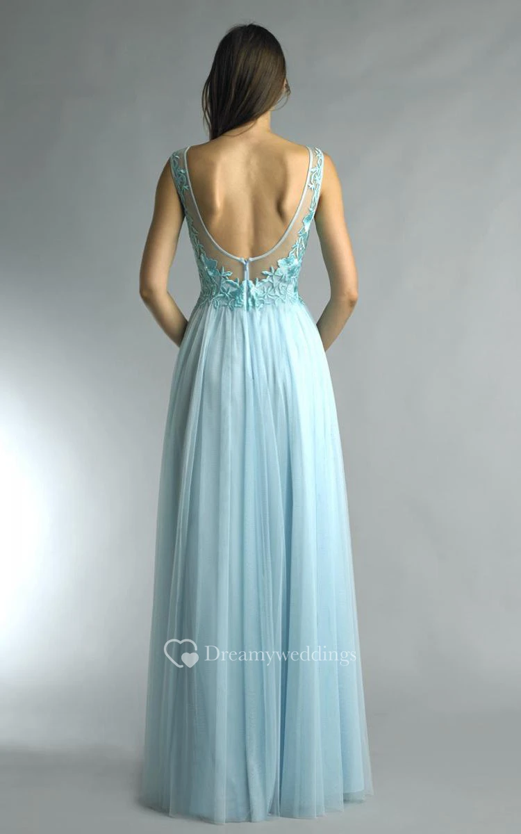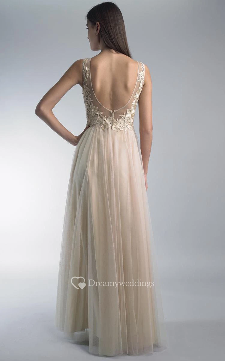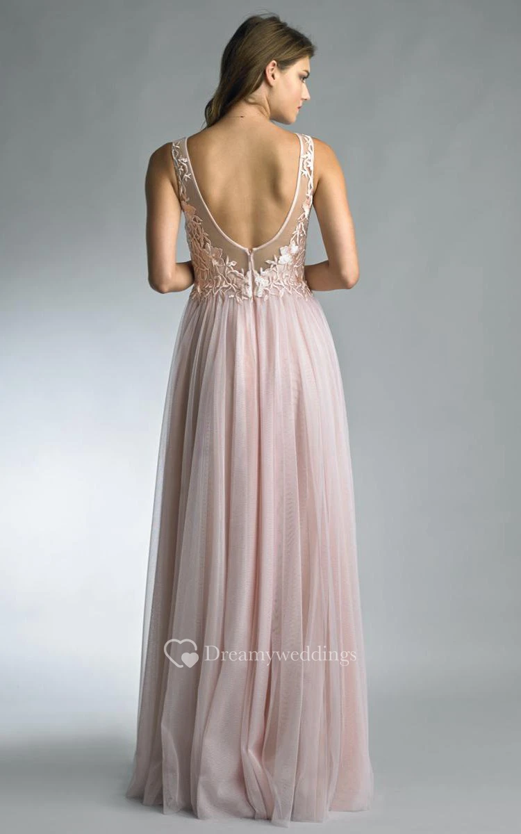 A-line Floor-length Jewel Sleeveless Tulle Low-V Back Dress