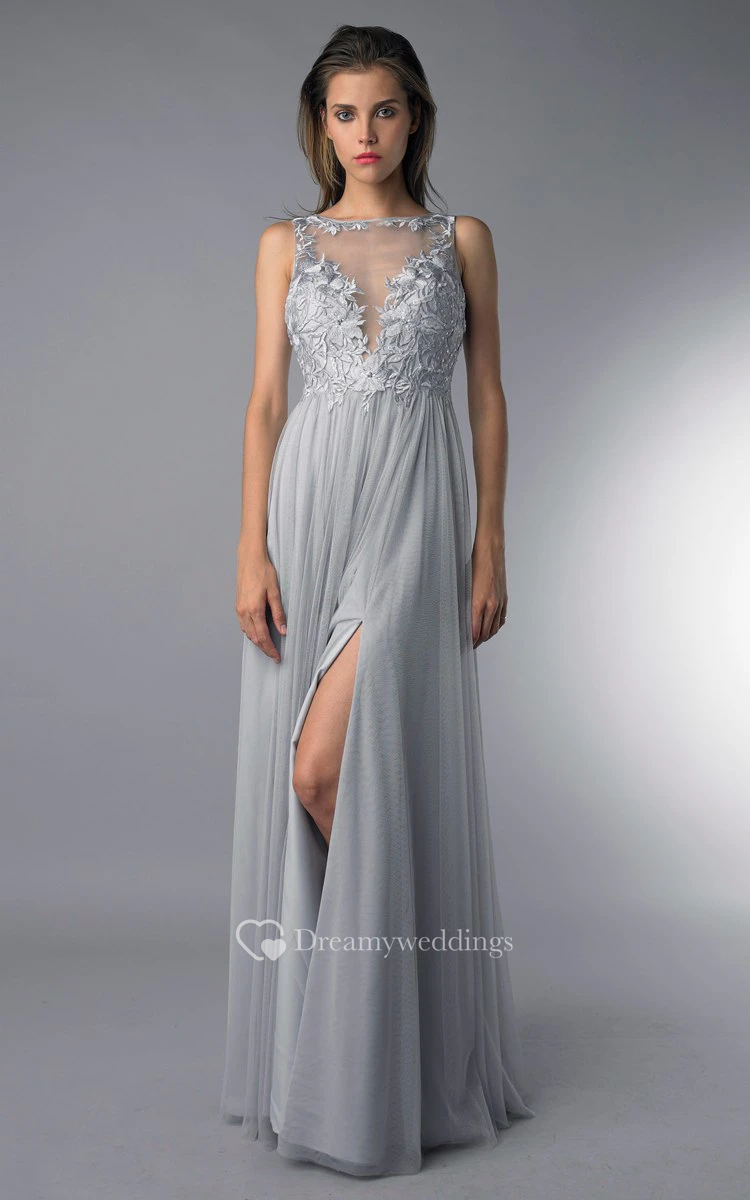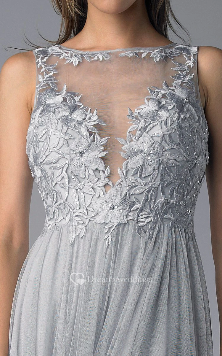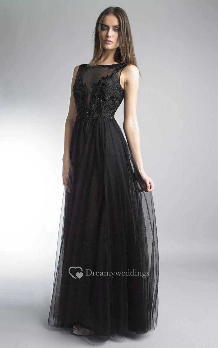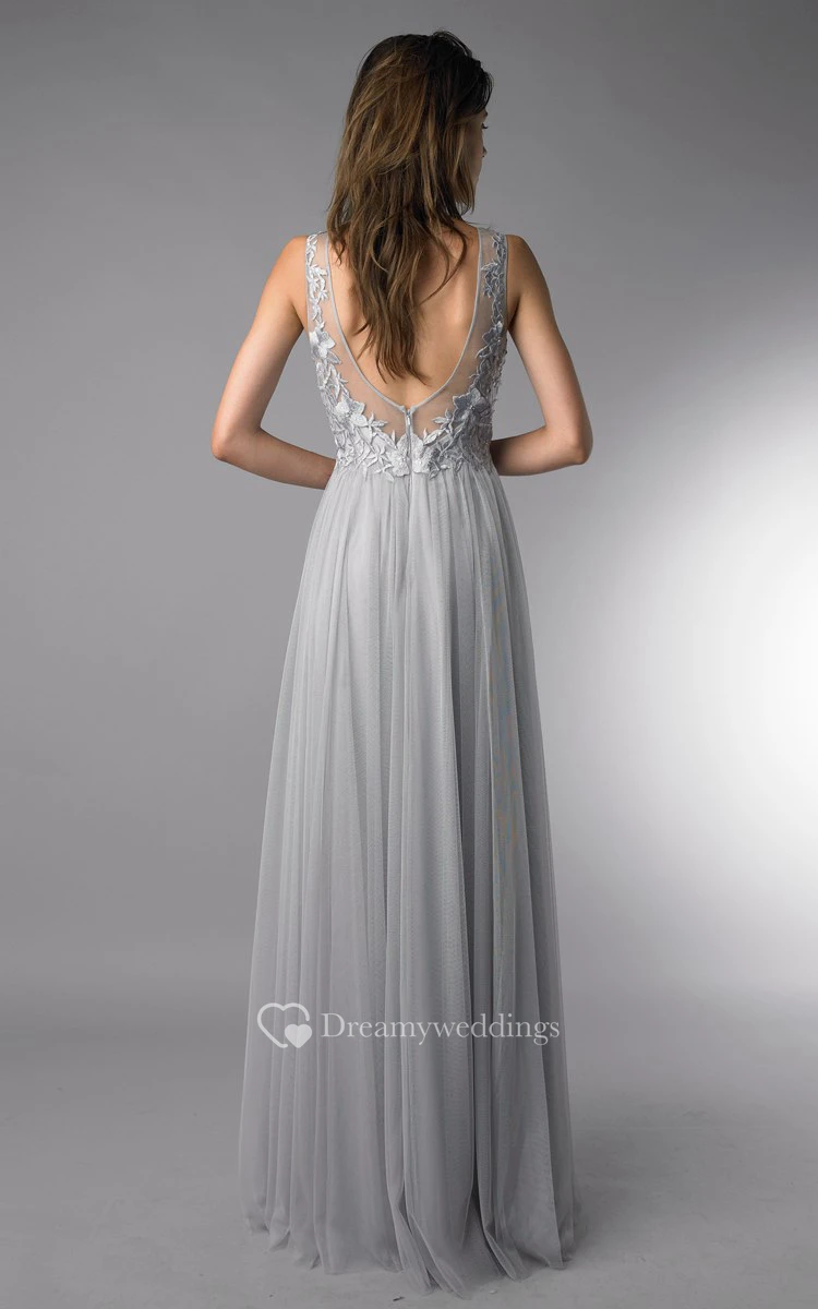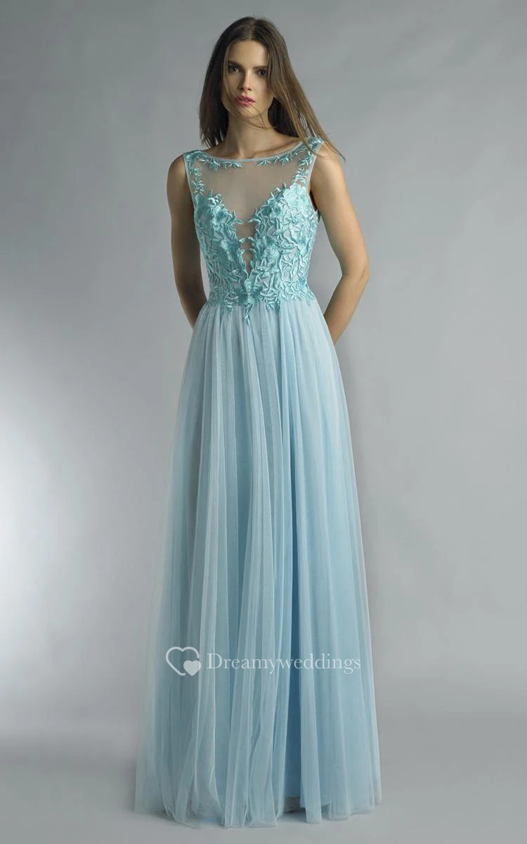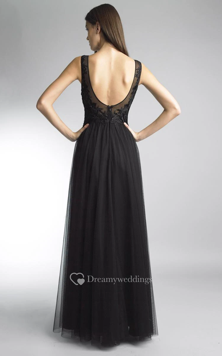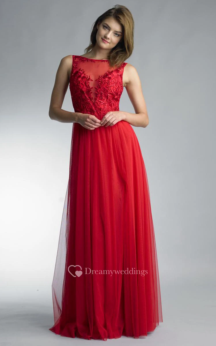 A-line Floor-length Jewel Sleeveless Tulle Low-V Back Dress