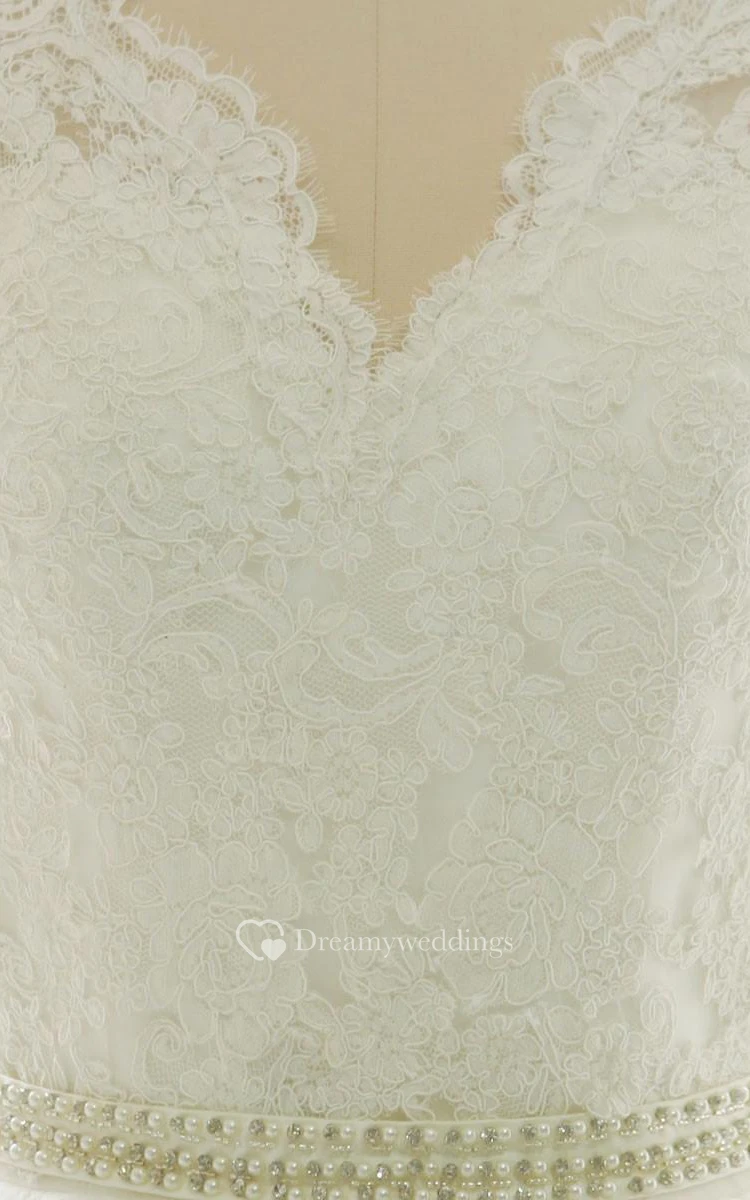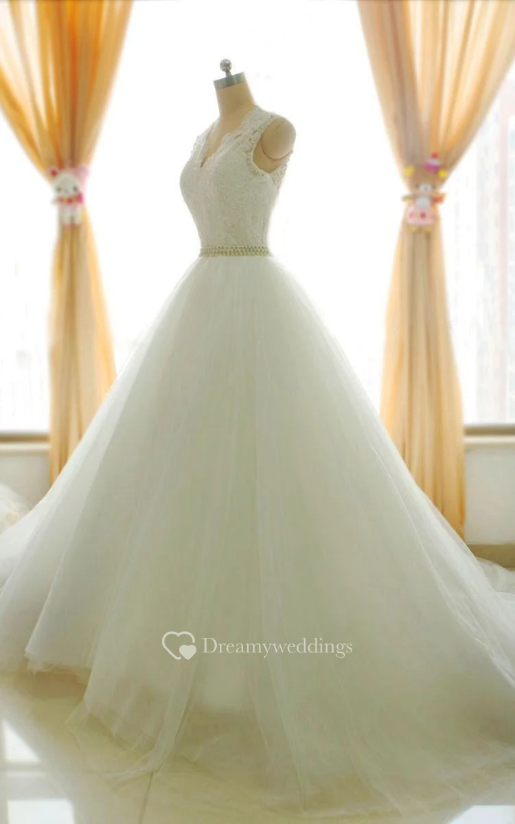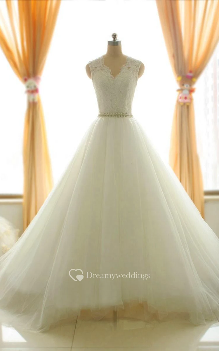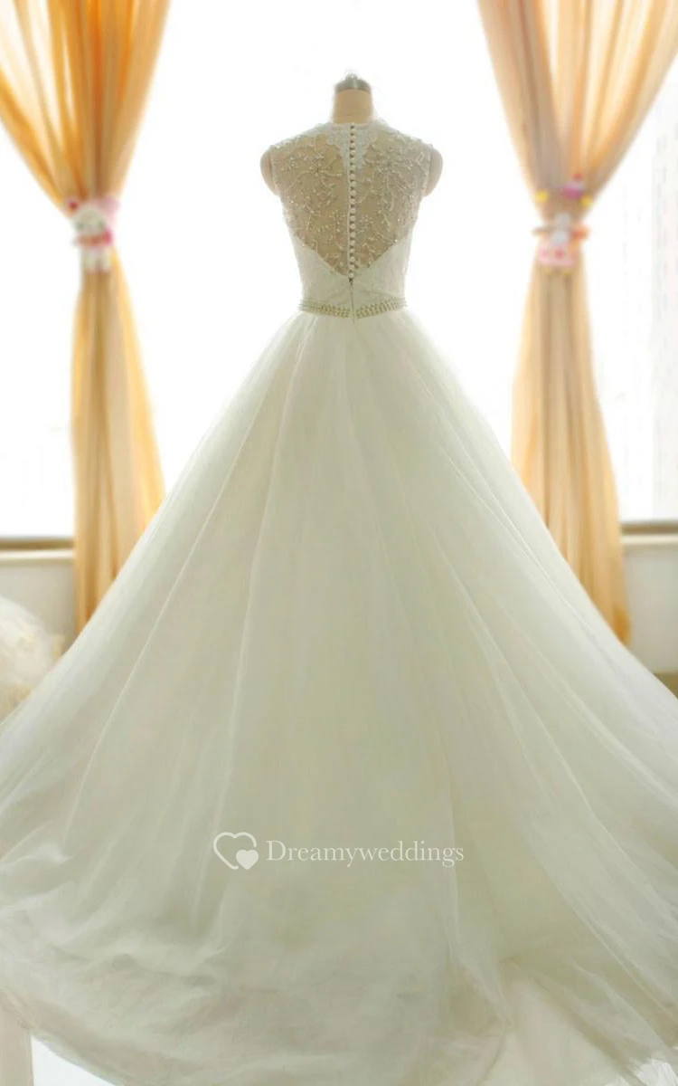 A-Line Floor-Length Long Sleeve Appliques Zipper Corset Back Tulle Lace Satin Dress