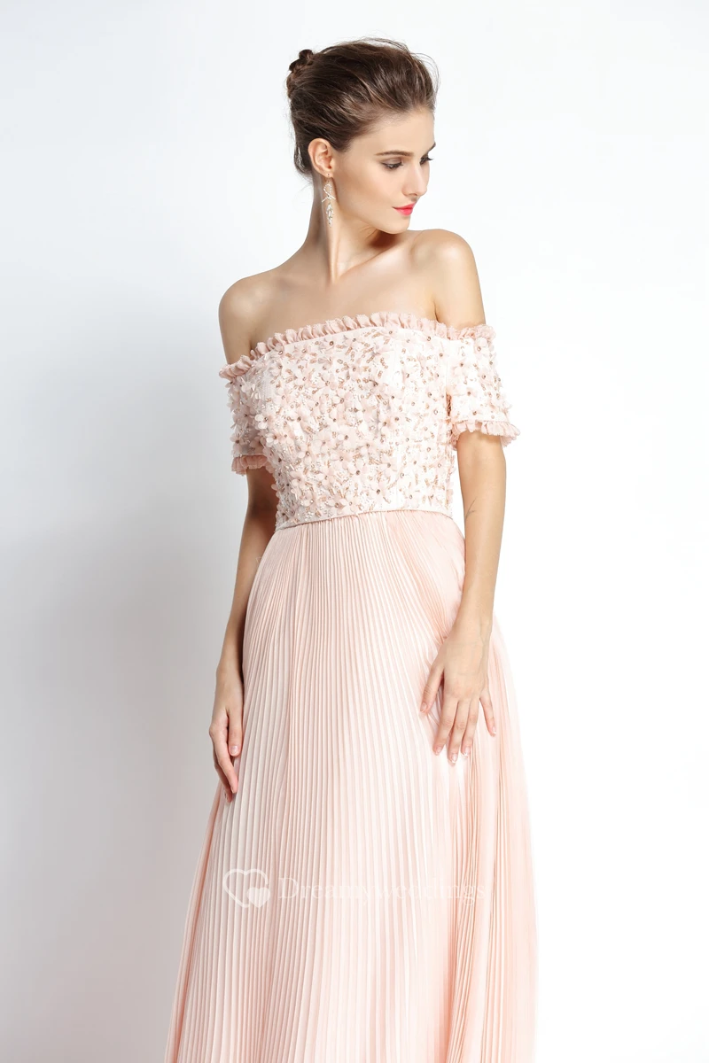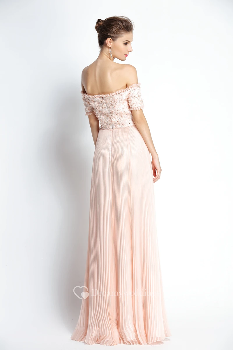 A-Line Floor-length Off-the-shoulder Chiffon Short Sleeve Prom Dress with Beading and Pleats